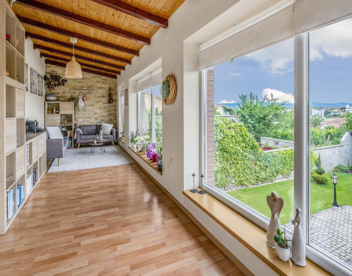 PRÍZEMIE: kuchyňa je prepojená s obývacou izbou a s jedálenskym kútom, z ktorého je výstup do zimnej záhrady s výhľadom na záhradu. V obývacej izbe sa nachdáza krb s výduchmi na horné poschodie. V stupnej chodbe sa nachádza samostatná toaleta.