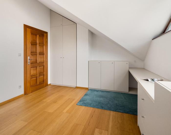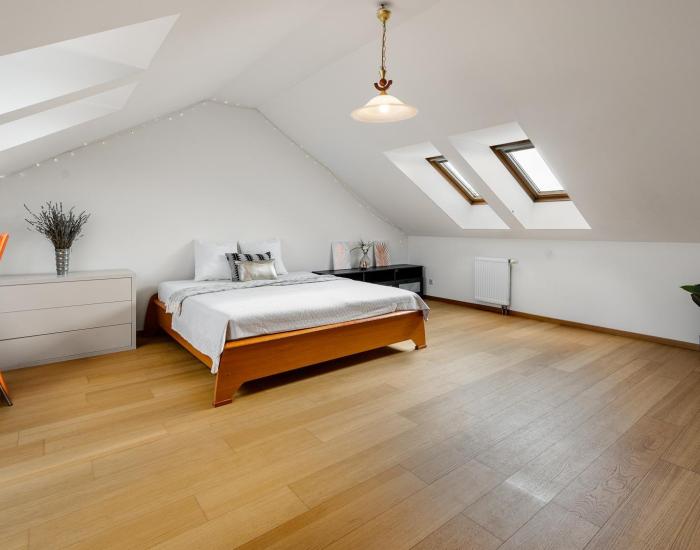 Poschodie: na druhom poschodí sa nachádza otvorená gáleria, 3 izby, 2x kúpelňa s toaletou a walk-in šatník, ktorý je možné prerobiť na d'aľšiu izbu.