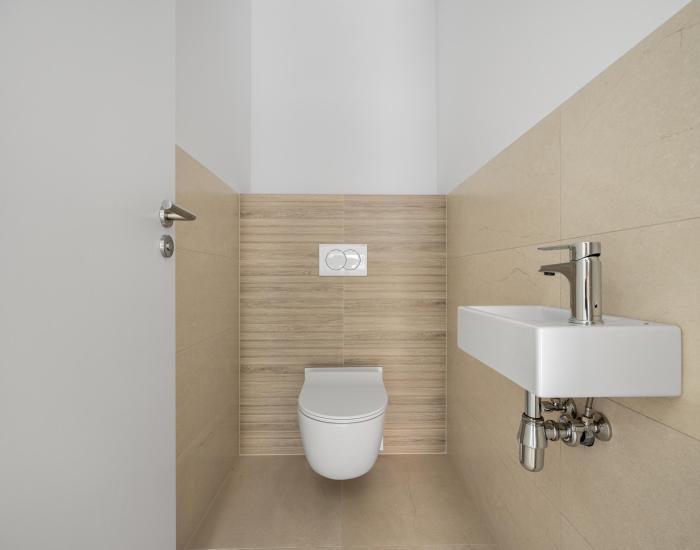 Štandard: obdĺžniková vaňa 170 x 70 cm + batéria + sifón s prepadom, sprchový kút 90x90 cm + batéria + žľab, závesné WC v kúpeľni + zabudovaný splachovací systém ( kúpeľňa +WC miestnosť), umývadlo 80 cm + batéria v kúpeľni, skrinka pod umývadlo 80 cm v kúpeľni, malé umývadlo + batéria vo WC miestnosti, interiérové dvere, biele, dlažba – vstupná hala, wc, kúpeľňa, technická miestnosť, obklad v kúpeľni, obklad vo WC.