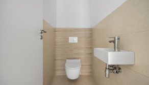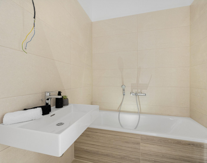 Dom: Štandard: obdĺžniková vaňa 170 x 70 cm + batérie + sifón s prepadom, závesné WC v kúpeľni + zabudovaný splachovací systém, umývadlo 80 cm + batéria v kúpeľni + samostatné WC, dlažba – vstupná chodba, WC, kúpeľňa, obklady v kúpeľni, interiérové dvere – biele, v ostatných miestnostiach parkety, vonkajšie obvodové murivo tehla Wienerberger – hrúbka 30 cm, vnútorná priečka Pezinská tehla – hrúbka 11,5 cm, zateplenie obvodového muriva – hrúbka 15 cm polystyrénových dosiek, fasádna omietka – hrúbka 1,5 cm, interiérové sadrové omietky, 20 + 20 cm stropná izolácia minerálnou vlnou, plastové okná a balkónové dvere 6 komorové – 3 sklo, bezpečnostné vchodové dvere so sklenenou výplňou, teplovodné kúrenie, 2x 5 cm podlahová izolácia, tepelné čerpadlo, zásuvky + vypínače, elektrická poistná skrinka, optické a dátové káble, elektrická predpríprava na alarm, elektrická predpríprava na studňu a závlahu, zabudované rozvody na klimatizáciu v obývačke, predpríprava na vonkajšie elektrické žalúzie