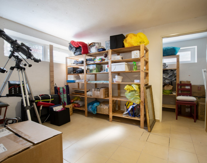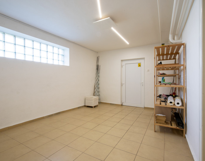 DISPOZÍCIA: 3 samostatné spálne na poschodí, priestranná spoločenská miestnosť na prízemí, 2x WC a kúpeľňa, kuchyňa, špajza, garáž, pivnica. Poschodie je kompletne zrekonštruované určené na bývanie. Na prízemí je možnosť zriadenia telocvične (pôvodne táto miestnosť bola využívaná na cvičenie jogy a meditácie pre viac ako 15 ľudí). V takomto prípade sa dá vytvoriť na prízemí šatňa aj sklad na športové pomôcky. Priestranný skladovací priestor v suteréne (100m² s viacerými miestnosťami) je vhodný na prevádzkovanie napr. internetového obchodu, alebo podnikovej predajne.
