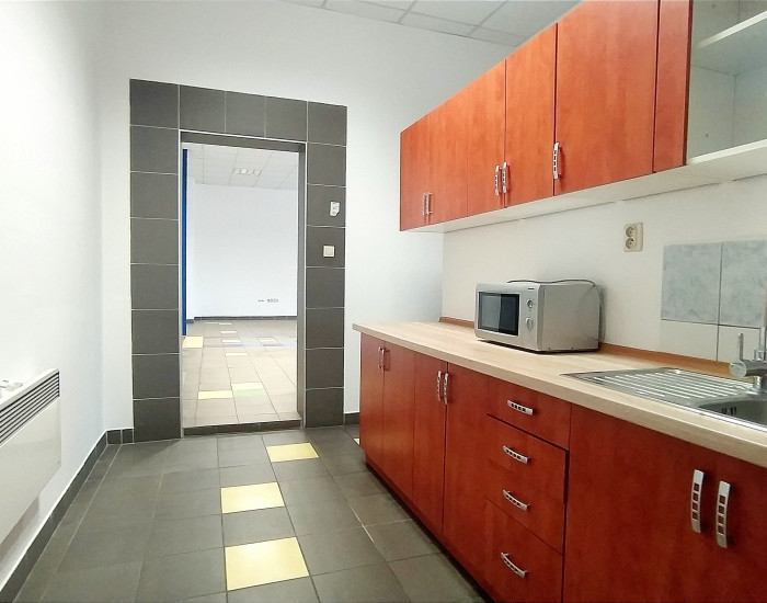 Kancelária k hale o výmere 110 m2 pozostáva z dvoch kancelárskych miestnosti, chodby s kuchynkou, 2x WC, technická miestnos. Kúrenie je elektrické – konvektormi.