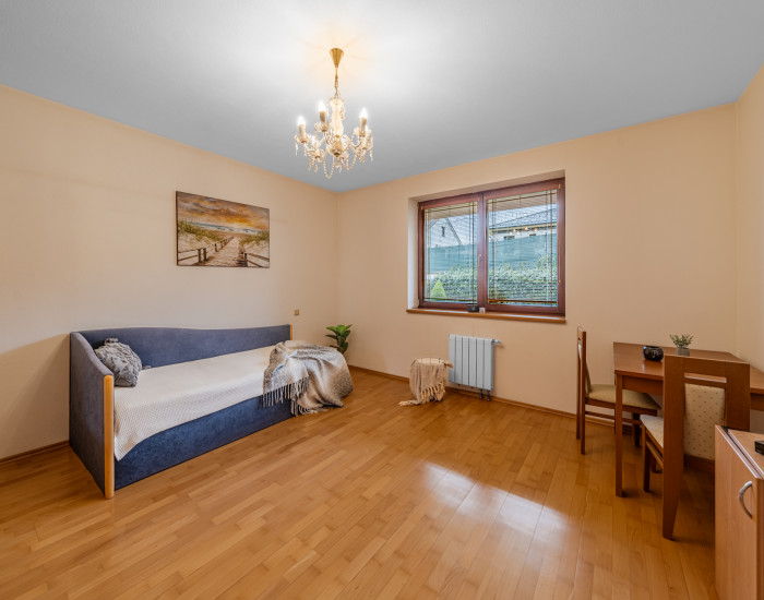 DISPOZÍCIA: Rodinný dom je trojpodlažný. Na prízemí sa nachádza vstupná hala s úložným priestorom a šatníkom, priestranná kúpeľňa so sprchovacím kútom, vaňou a toaletou, hosťovská izba, priestranná obývacia izba, so vstupom na terasu a záhradu, prepojená s jedálenskou časťou a kuchyňou, skladový priestor. Druhé nadzemné podlažie tvorí hlavná spálňa so vstupom na veľkú loggiu, kúpeľňa s vaňou, toaleta. Ďalej 3 samostané izby, Podzemné podlažie tvorí priestranná miestnosť aktuálne využívaná ako fitness a relax zóna s vírivkou. Ďalej priestor, ktorý po menšej úprave poskytuje možnosť vytvorenia vnútorného bazéna, technická miestnosť, kúpeľňa s toaletou.