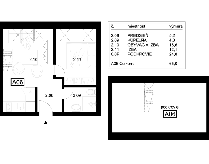 APARTMÁN: Celková plocha apartmánu je 65 m2 z čoho je výmera podkrovia 24.80 m2. Nachádza sa na 1.poschodí a v podkroví apartmánového domu.