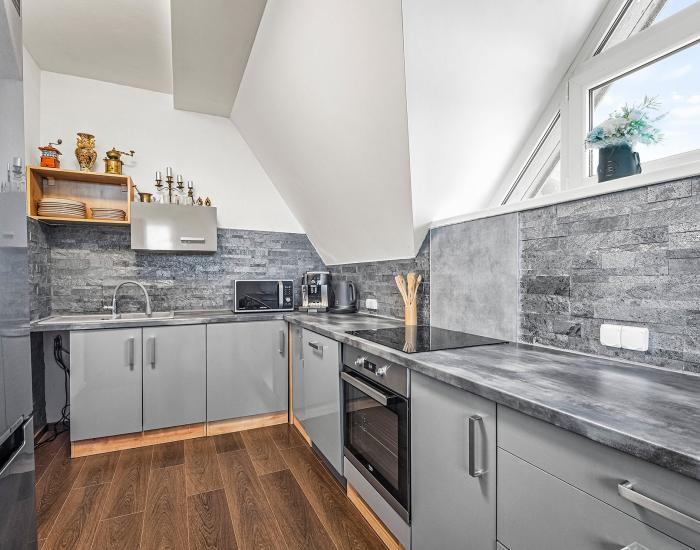 APARTMÁN: Celková výmera apartmánu je 132,45 m2 vstup do apartmánu sa nachádza na 2 podlaží apartmánového domu bez výťahu. Apartmán disponuje 2 balkónmi orientovanými na východ, tiež pivnicou na prízemí. Na 1 podlaží apartmánu sa nachádza priestranná kuchyňa s jedálňou prepojená s obývacou izbou, jedna spálňa, kúpeľňa a samostatné WC. V podkroví sa nachádzajú dve spálne, kúpeľňa s WC. K apartmánu prislúcha aj podiel na spoločných častiach domu, kde patrí aj priestranná záhrada, altánok s možnosťou grilovania a posedení, ktorý je kompletne oplotení a využívaný len vlastníkmi nehnuteľností.