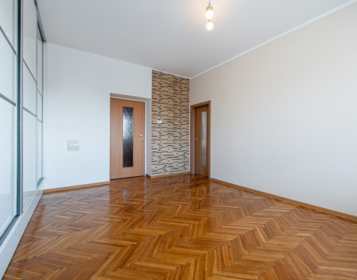 DISPOZÍCIA: Byt je priechodný v celej svojej dispozícii. Pozostáva zo vstupnej chodby, WC a vstupu na zasklennú loggiu. Z kuchynskej časti , ktorej súčasťou je aj menšia špajza sa prechádza do kúpeľne a priamo aj do priestrannej obývacej izby z ktorej sa daľej prechádza do samostatnej spálne so vstavanými skriňami a šatníkom.