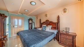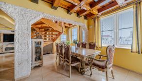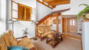 DISPOZÍCIA: Dispozíciu bytu tvoria štyri obytné miestnosti s príslušenstvom. V priestoroch vstupného podlažia sa nachádza vstupná predsieň (podlaha z gresovej dlažby, časť stien je opatrená obkladom z kameňa), technická miestnosť, chodba, WC, kúpeľňa, pracovňa, obývacia izba s jedálňou a masívnym dreveným schodiskom do podkrovného podlažia, kuchyňa a jedna izba (spálňa). Z miestností na podlaží sú prístupné dva balkóny a dve terasy. V priestoroch podkrovného podlažia sa nachádza galéria so schodiskom, šatník, kúpeľňa a dve izby (spálne). Z priestorov v podkrovnom podlaží je prístupný jeden balkón. V podzemnom podlaží budovy sa nachádza pivnica (príslušenstvo bytu). Okná obytných miestností bytu sú orientované na severozápad, juhozápad a juhovýchod.