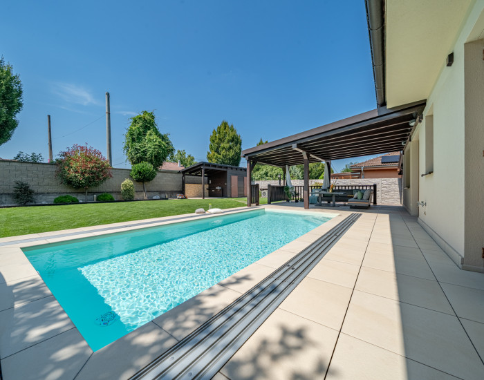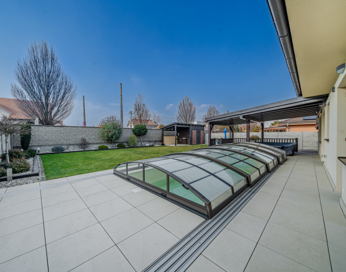 Rozloha pozemku je 600 m² a ide o rovný, obdĺžnikový pozemok, ktorý poskytuje priestranný a komfortný priestor. Oplotenie zadnej časti pozemku a bočných strán tvorí betónový plot, predná časť pozemku je oplotená kovovým plotom s bráničkou a posúvnou bránou vedúcou do dvojgaráže. Pred garážou sa nachádza státie pre 2 vozidlá. Okolie domu je vybavené chodníkom vedúcim na terasu, kde sa nachádza bazén s priezračnou sladkou vodou a prekrytá terasa so zatienenou roletou Zipscreen na diaľkové ovládanie.