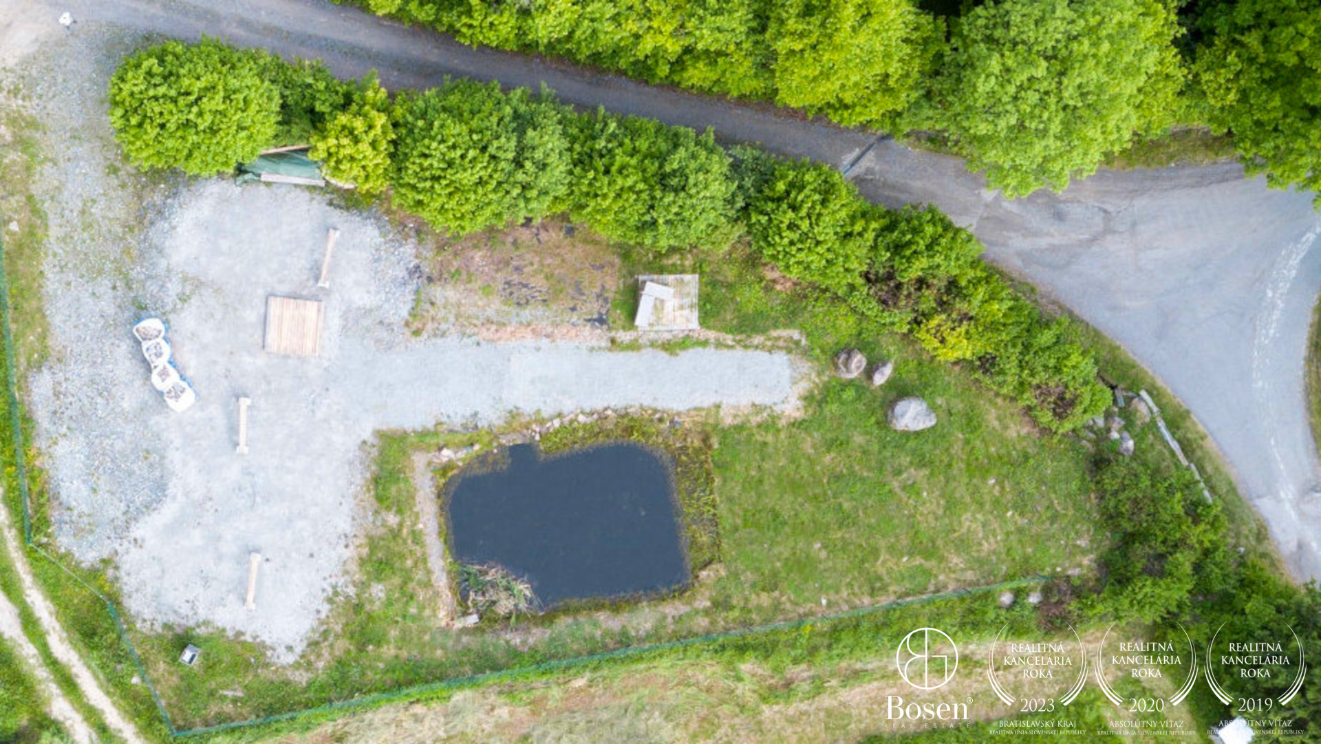 Pri jazierku je vybudovaný štrkový chodník cca 3 × 15 m, ktorý dotvára funkčný aj oddychový charakter pozemku. Vjazd na pozemok je hotový, podklad je spevnený a pripravený na okamžité používanie bez ďalších stavebných zásahov.
