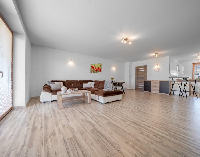 DISPOZÍCIA: Predsieň so vstavanou skriňou a vstupom do práčovne s toaletou, obývacia izba spojená s jedálňou, vstupom na terasu a kuchyňou (44m2), 3x spálňa, pracovňa, kúpeľňa s vaňou, veľkým sprchovým kútom a toaletou.