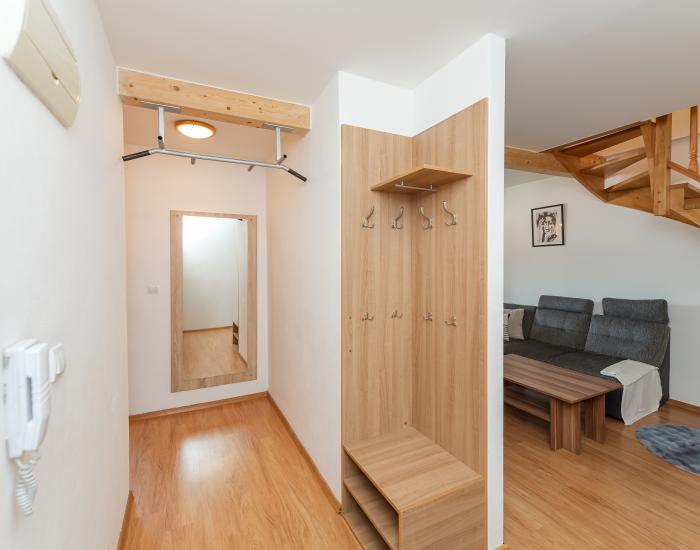 DISPOZÍCIA: vstupná chodba, kúpeľňa s vaňou a toaleta, špajza, obývacia izba spojená s kuchyňou a jedálenským kútom, dve samostatné spálne na poschodí (mezonetová časť), schodisko