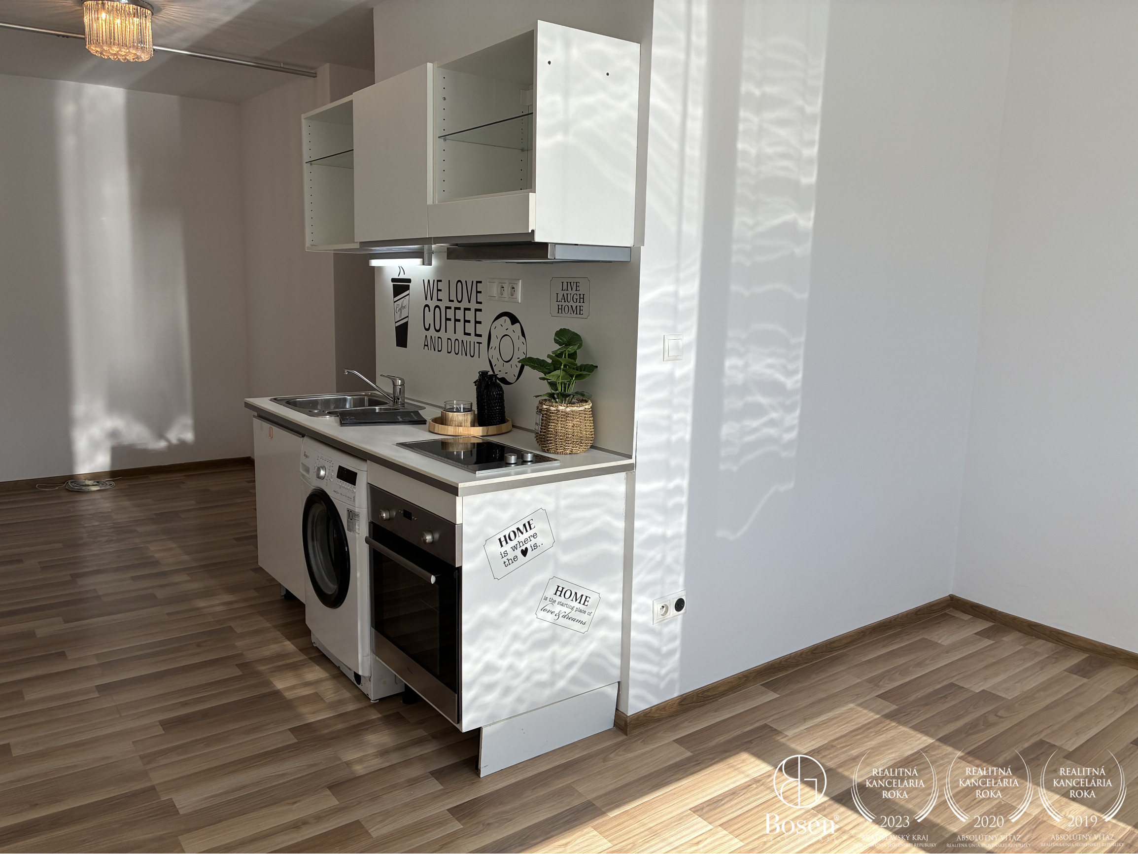 Byt sa predáva spolu so spotrebičmi dennej potreby, práčkou a elektrická rúra značky Whirlpool. V kuchynskej linke je zabudovaná sklo keramická varná doska.