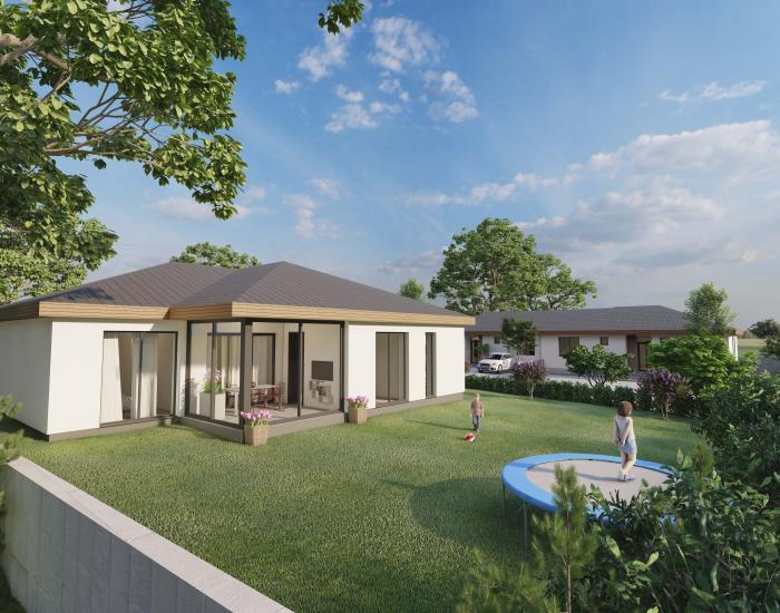 SAMOSTATNE STOJACI RODINNÝ DOM: v ponuke sú 2 prízemné 4 izbové rodinné domy, ktoré je možné po zapracovaní zmien postaviť ako 5 izbové. Domy budú postavené do štádia "štandard"- vymaľované steny, osadené vypínače, zásuvky, interiérové dvere a zárubne, obklady a sanita v kúpeľniach vrátane dokončeného exteriéru - oplotenie, brána a vybudované parkovacie miesta pred domom. Farebné prevedenie štandardu je voliteľné. V cene je predpríprava na vonkajšie elektrické žalúzie, klimatizácia, alarm a fotovoltiku. Vykurovanie bude zabezpečené tepelným čerpadlom. Domy budú napojené na elektrinu, vodu, kanalizáciu a optickú sieť. Projekt je v štádiu prípravy výstavby (realizácia inžinierských sietí) predpokladaný termín zahájenia výstavby rodinných domov je koniec roka 2025 a predpokladaný termín dokončenia je v prvej polovici roka 2027.