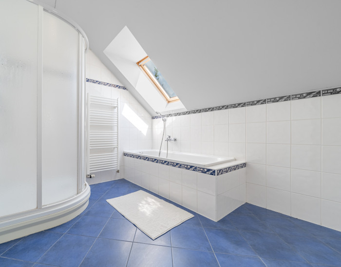 DISPOZÍCIA: Zastavaná plocha domu je 288 m2 a celková úžitková plocha je 468 m2. Na podzemnom podlaží sa nachádza garáž o rozlohe 84 m2, technická miestnosť, vínna pivnica a squashová hala/telocvičňa. Na prvom nadzemnom podlaží sa nachádza kuchyňa s obývačkou, pracovňa, kúpeľňa s toaletou, práčovňa a vstupná chodba. Z obývačky je výstup na terasu. Na druhom nadzemnom podlaží sa nachádza spálňa, detská izba, hosťovská izba, kúpeľňa, samostatná toaleta, šatník a balkón na ktorý je výstup z 2 izieb. Súčasťou je aj pochôdzna povala pod strechou.