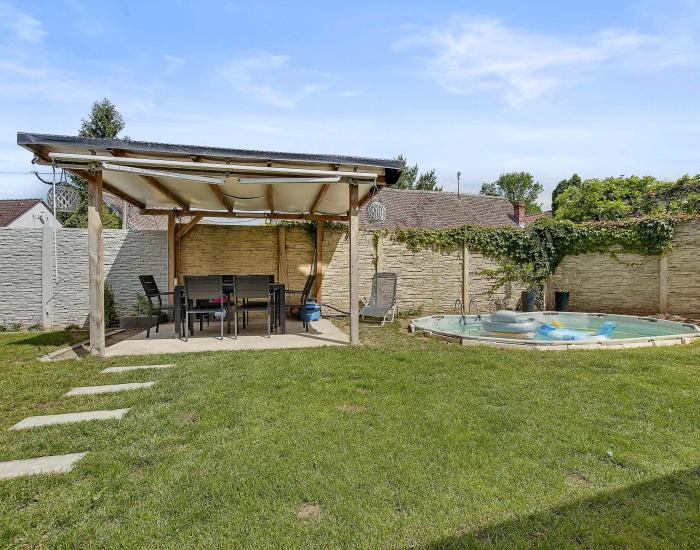 POZEMOK: upravený pozemok o výmere 215m2. Je kompletne oplotený s elektrickou posuvnou bránou. Dominantou dvora je útulný altánok so sedením, ideálny na letné grilovanie alebo odych. Benefitom je bazén, ktorý Vám spríjemní horúce letné dni. Pozemok je udržiavaný s trávnikom a príjemným súkromým vďaka oploteniu.