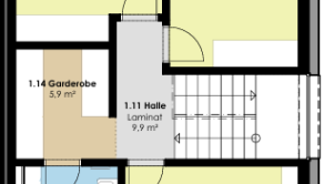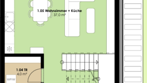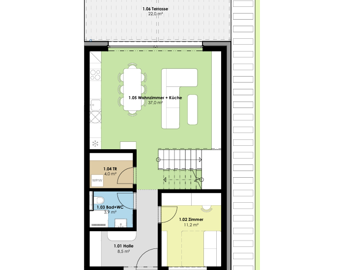 1NP – (64,60 m2) – predsieň, chodba, technická miestnosť, toaleta, kúpeľňa, kuchyňa spojená s obývacou miestnosťou a s priamym vstupom na terasu, sklad, terasa