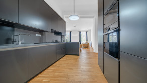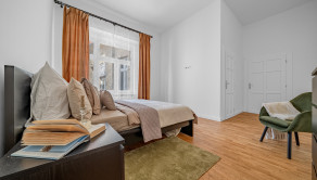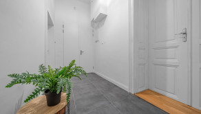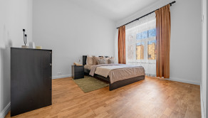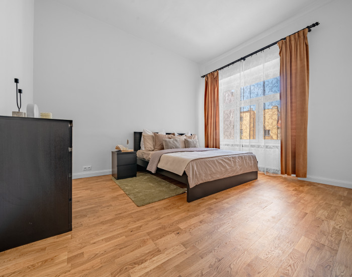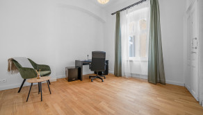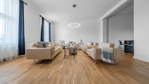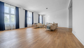 BYT: Celková výmera bytu je 116 m2 z čoho pivničná kobka tvorí 10 m2. Byt sa nachádza na 2./ 3. poschodí historického bytového domu. Má dve samostatné izby orientované do vnútrobloku a priestrannú obývaciu izbu s výhľadom do "Prezidentskej" Grasalkovičovej záhrady.