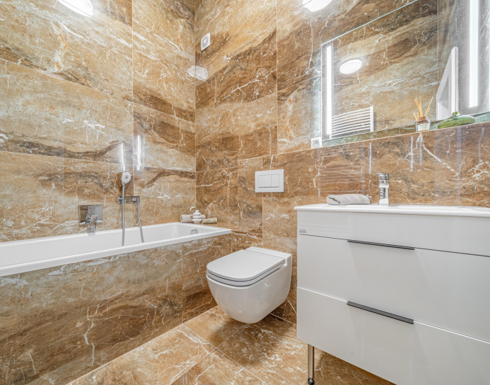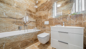 DISPOZÍCIA: Vstupná chodba, izba kúpeľňa so sprchovým kútom, priestranná obývacia izba, kuchyňa, kúpeľňa s vaňou a hlavná spálňa.