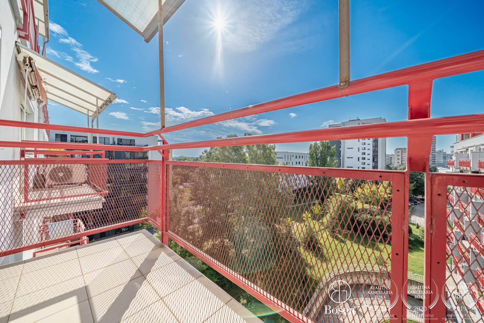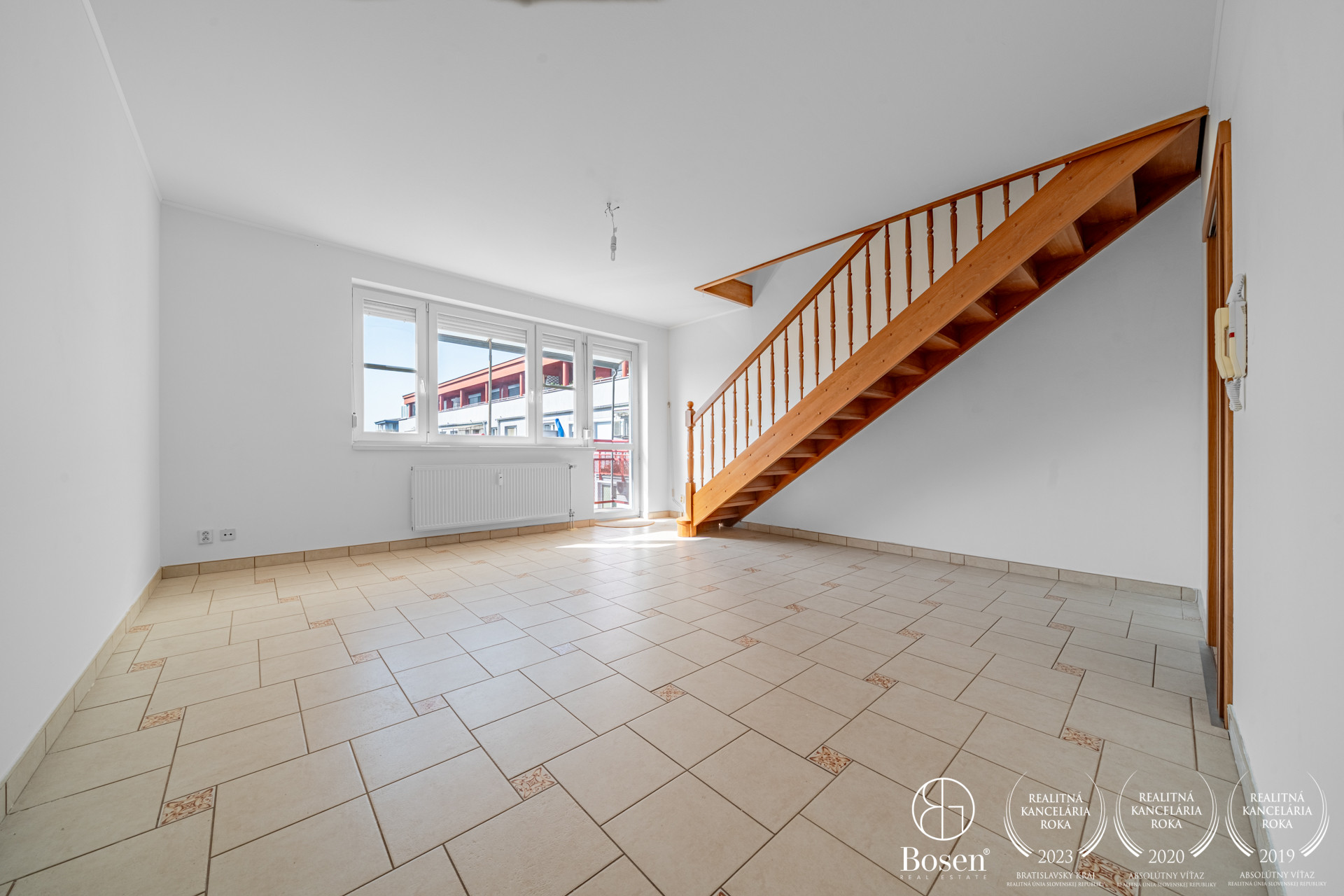 BYT: Podlahová plocha mezanínu je 85 m² a prislúcha k nemu murovaná pivnica (5m2) a priestranný balkón s loggiou o veľkosti 10 m². Mezanín sa nachádza sa na 6. poschodí presahujúci na 7. poschodie. Bytový dom s výťahom bol skolaudovaný v roku 2005. Mesačné náklady pre jednu osobu predstavujú 110 EUR pre správcu. Orientácia bytu je na JZ (obývacia izba a jedna izba na poschodí) a SZ (ostatné miestnosti).