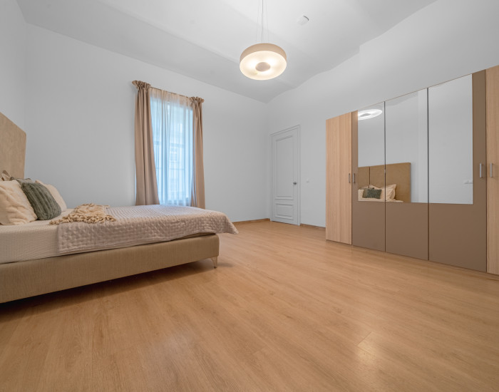 FURNISHING: The apartment is rented partially furnished. The kitchen is equipped with a kitchen unit with an induction cooktop, refrigerator, and freezer. In the wardrobe there are closets and one of the bedrooms has a bed. In both bathrooms there is a toilet, shower, and a freestanding bathtub.