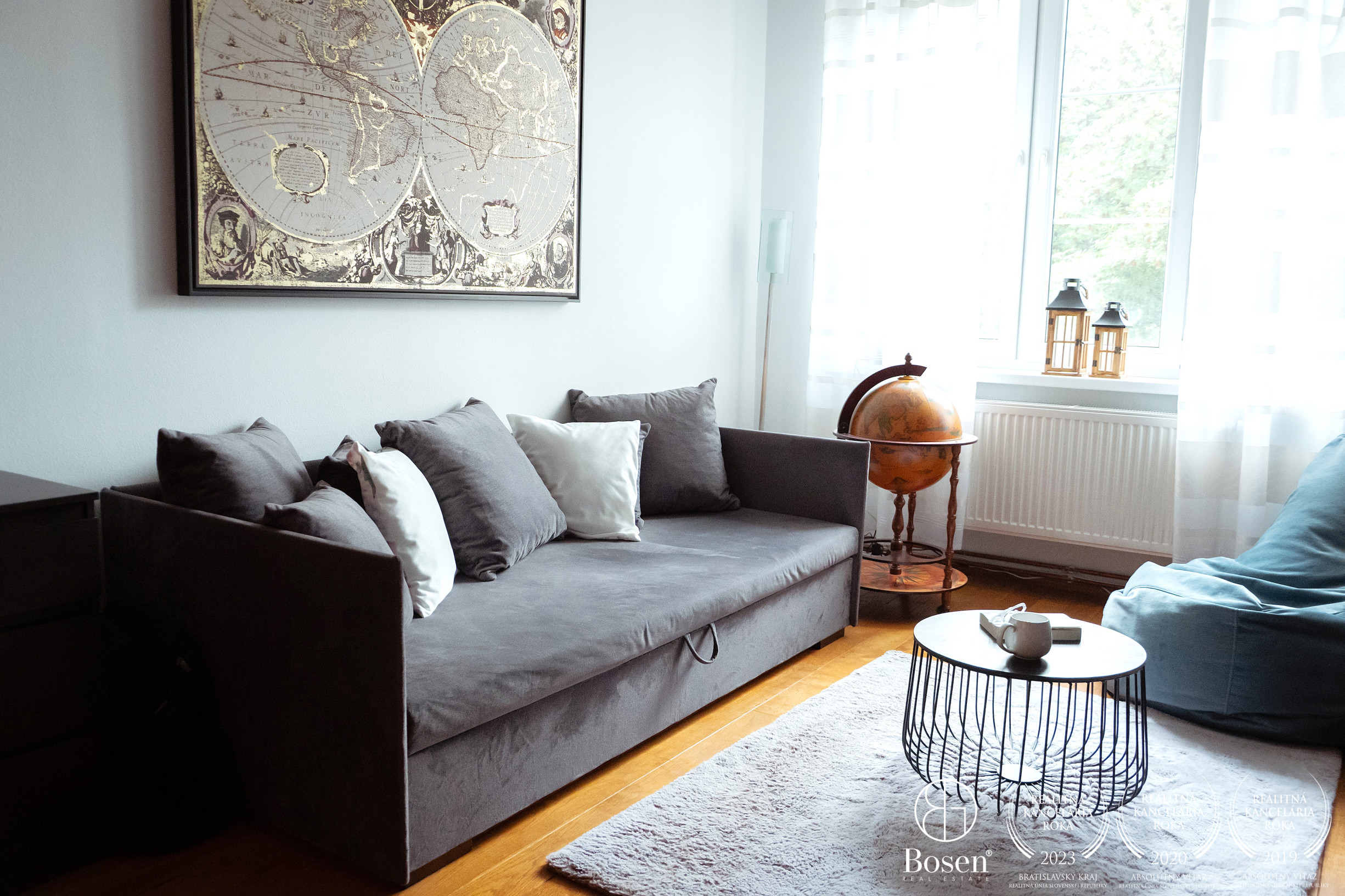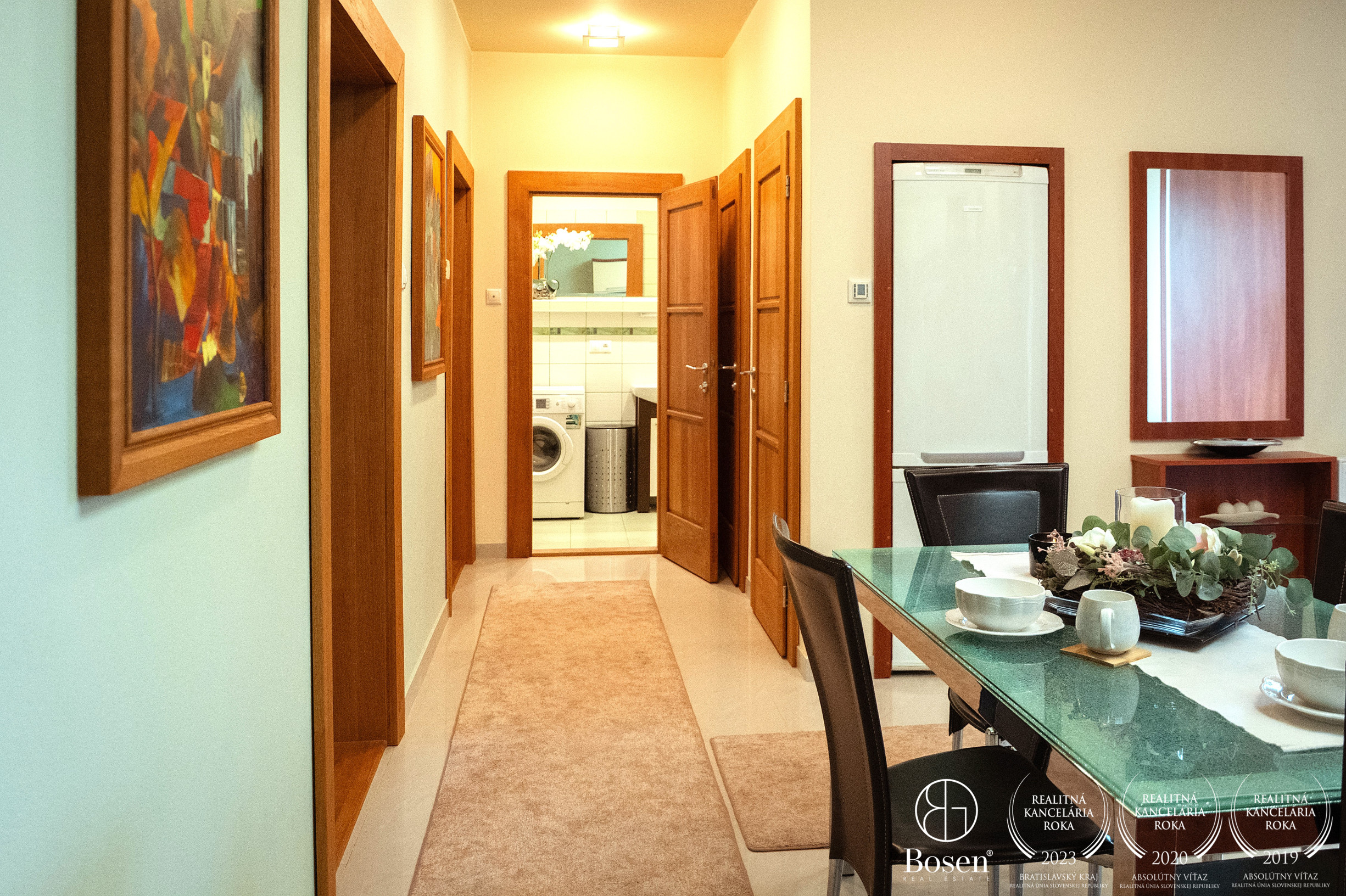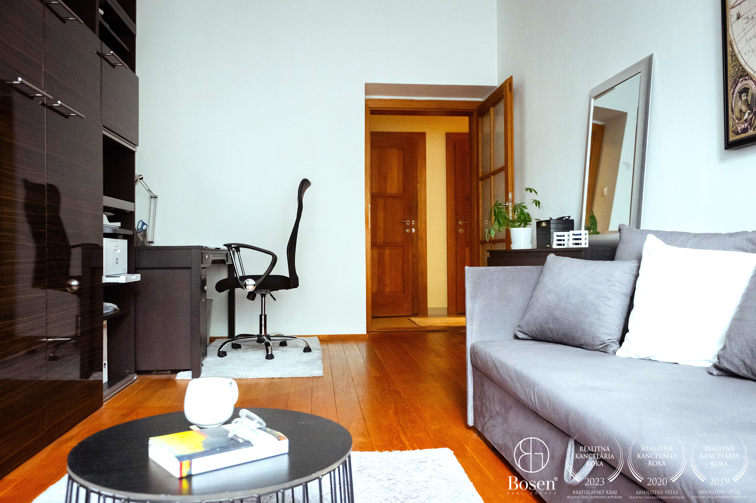 Interiér spája nadčasovú estetiku s funkčným dizajnom. Dominantou dennej časti je priestranná obývacia izba s krbom, ktorý vytvára neopakovateľné teplo domova. Byt sa predáva kompletne zariadený, čo vám umožní okamžité nasťahovanie bez ďalších investícií.