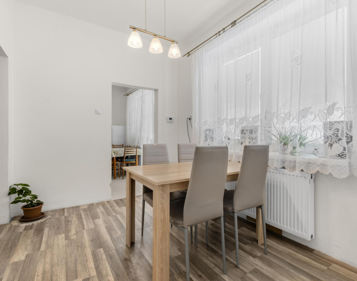 DISPOZÍCIA: vstupná chodba, jedáleň, kuchyňa, 2 prechodné izby, obývačka, kúpeľňa so sprchovým kútom, samostatné WC. Vstup na terasu je z kuchyne. Dom je čiastočne podpivničený.