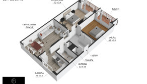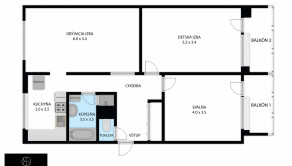 DISPOZÍCIA: Chodba so vstavanou skriňou, z ktorej je vstup do detskej izby, spálne, samostatného WC, kúpeľne a kuchyne. Z kuchyne je vstup do obývačky. Z detskej izby a spálne je vstup na loggiu. K bytu patrí pivničná kobka. Presnú dispozíciu si viete pozrieť prostredníctvom 3D virtuálnej obhliadky!!!