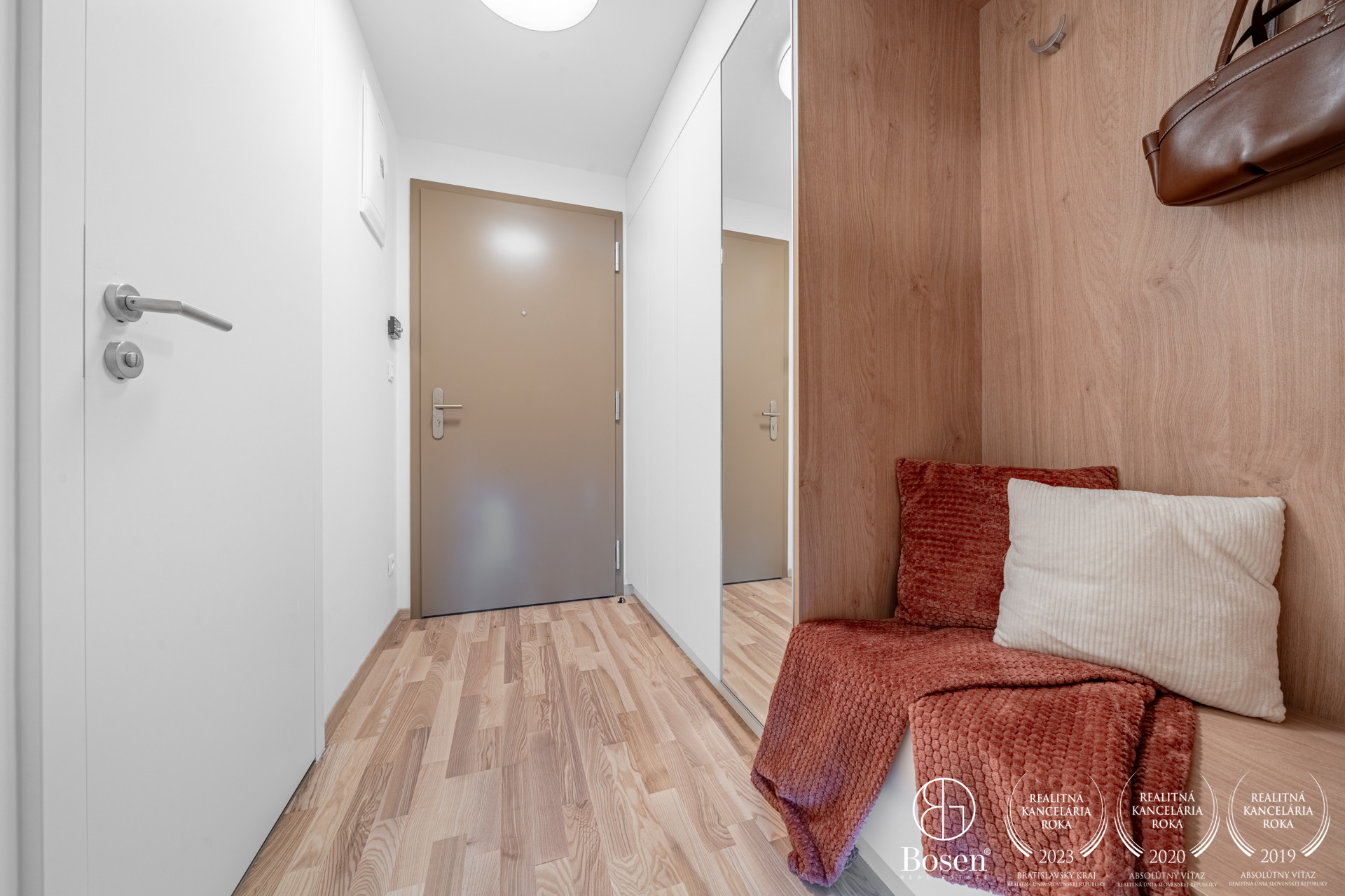 ZARIADNIE: Byt je kompletne zariadený - šatníková skriňa vo vstupnej chodbe, kuchynská linka so vstavanými spotrebičmi ( umývačka riadu, indukčná varná doska, elektrická rúra, chladnička s mrazničkou, mikrovlnná rúra, práčka), barový pult so stoličkami, rozkladacia sedačka ( s matracom ), skrinka pod TV, skrinka v kúpelni so zrkadlom a uložné skinky. Vybavenie - tyčový vysávač, mop, žehliaca doska, žehlička, sušiak na prádlo, kompletné kuchynské vybavenie ( hrnce, taniere, príbory, rýchlovarná kanvica, paplóny, obliečky, vankúše, uteráky.