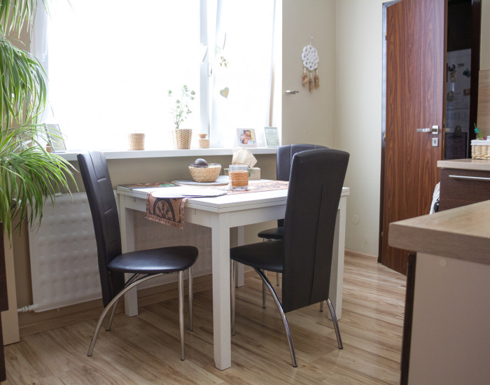 Zo vstupnej chodby je prístup do kúpeľne a samostatného WC. Ďalej sa dostaneme do troch izieb – priestrannej obývačky s výstupom na balkón, veľkej izby vhodnej ako spálňa či detská izba a ďalšej samostatnej izby. Z chodby vedie vstup do kuchyne a štvrtej izby.