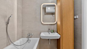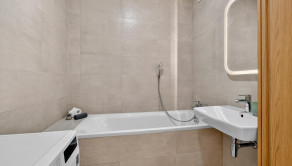 Kúpeľňa je vybavená vaňou, práčkou a kúpeľňovým nábytkom.