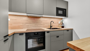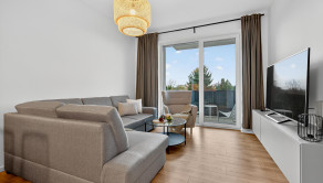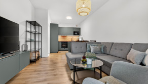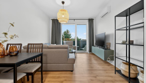 Byt je kompletne a moderne zariadený – priestranná rozkladacia sedačka, pohodlné kreslo, TV skrinka s televízorom, konferenčný stolík, jedálenský stôl so stoličkami, plne vybavená kuchynská linka so vstavanými spotrebičmi (rúra, varná doska, digestor, umývačka riadu, chladnička s mrazničkou).