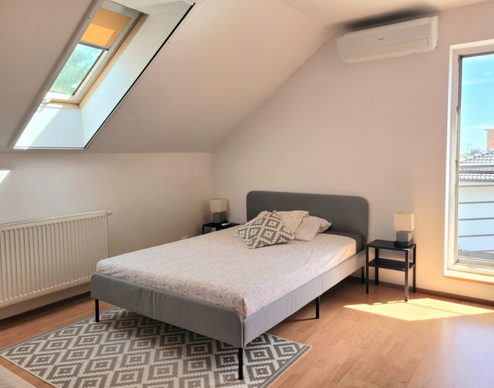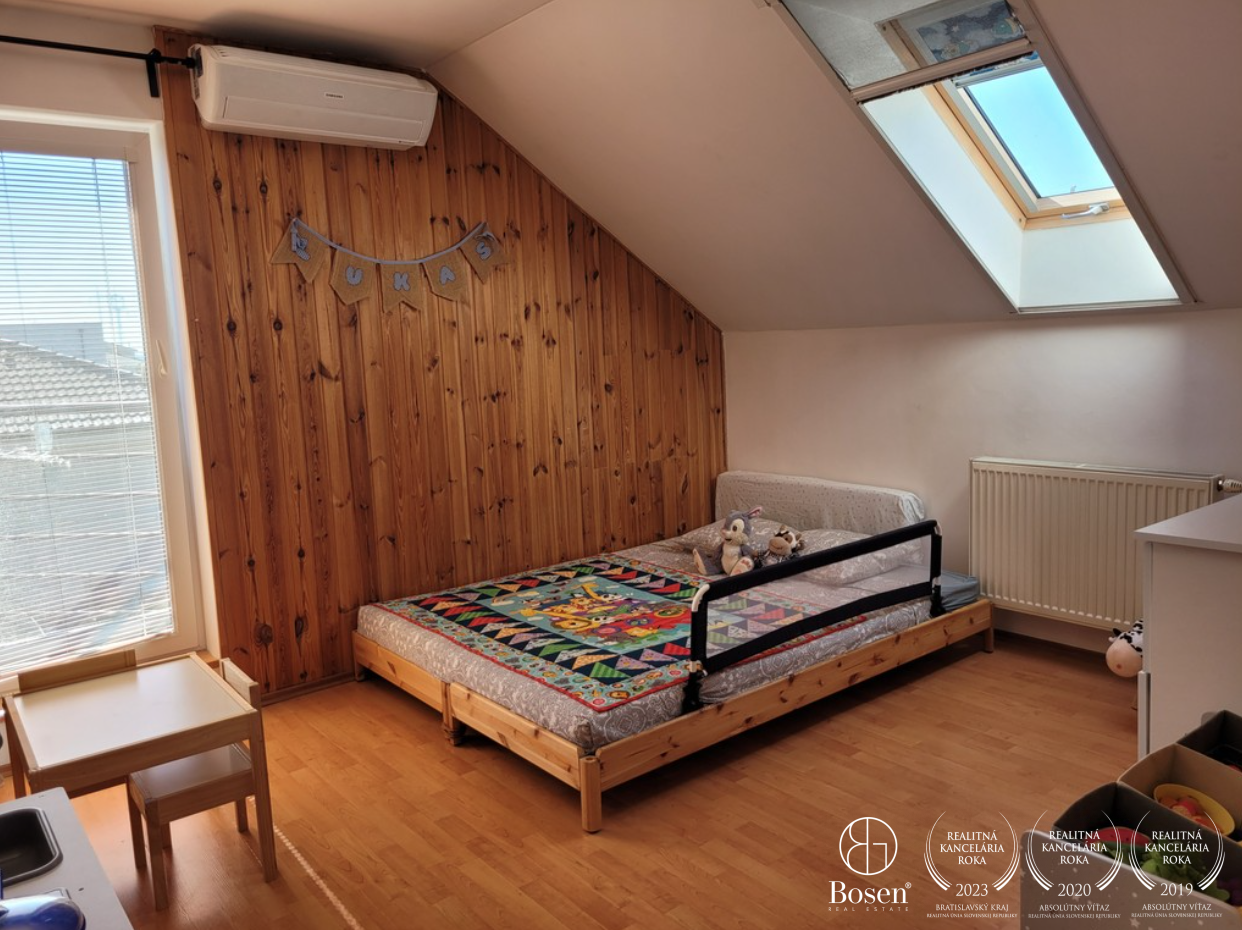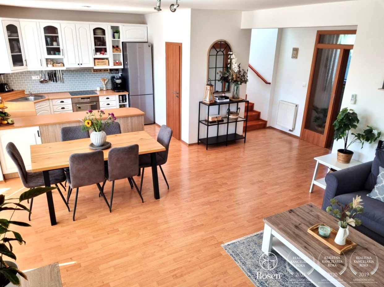 DISPOZÍCIA: Na prízemí domu sa nachádza veľká vstupná chodba so vstavanými skriňami a kúpeľňa s WC a sprchovým kútom, priestranná obývacia časť spojená s jedálenskou časťou a kuchyňou (so špajzou) s výstupom na zimnú aj vonkajšiu terasu, a 1 samostatná izba, z ktorej je vytvorená veľká pracovňa. Na poschodí domu sa nachádzajú 3 samostatné spálne, kúpeľňa s vaňou, sprchovým kútom a WC a ďalšie samostatné WC. Dom je presvetlený veľkými oknami, čo zabezpečuje dostatok prirodzeného svetla počas celého dňa.