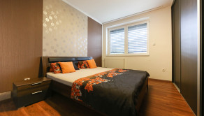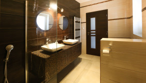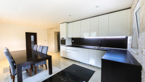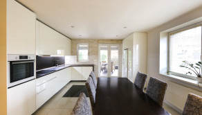 ZARIADENIE: Vykurovanie rodinného domu a príprava TÚV sú zabezpečené elektrickým kotlom, umiestneným na poschodí rodinného domu. V celom rodinnom dome sú osadené vykurovacie oceľové panelové telesá a v kúpeľmi je osadený rebríkový radiátor. Podlahové krytiny sú zvolené s dôrazom na pohodlie aj estetiku - v obytných miestnostiach je plávajúca podlaha, zatiaľ čo v chodbe, kuchyni spojenej s jedálenskou časťou, kúpeľni a toalete je dlažba z keramických veľkoformátových dlaždíc. Všetky okenné výplne, vrátane vchodových dverí, vonkajších dverí na terasu, sú atypické plastové, zasklené izolačným dvojsklom. Kuchyňa je plne vybavená - súčasťou je moderná kuchynská linka so vstavanými spotrebičmi: elektrická varná doska, teplovzdušná rúra, umývačka riadu, digestor, chladnička a práčka. Nechýba ani nerezový drez s praktickou odkladacou plochou.