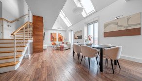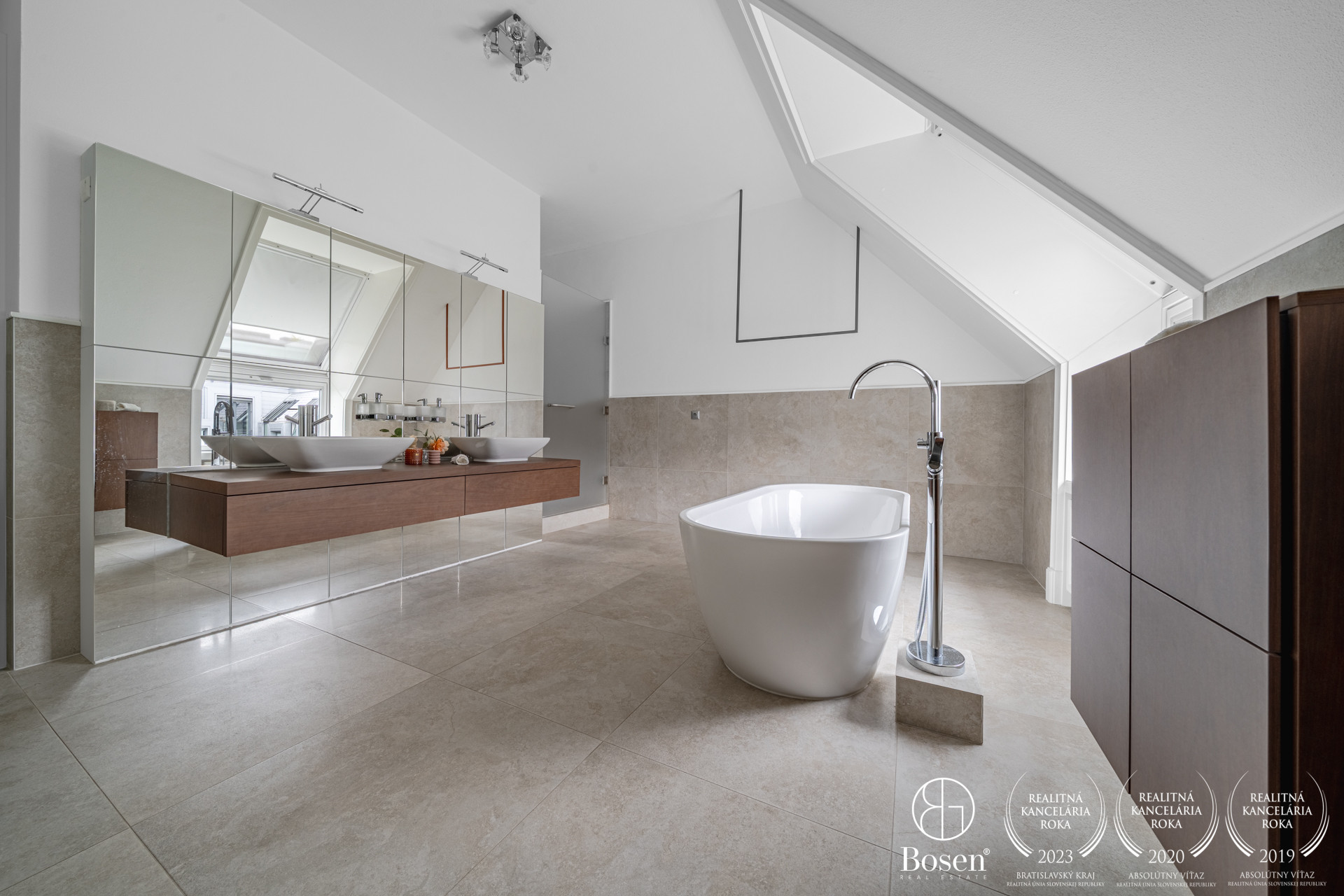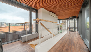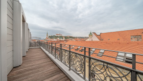 LAYOUT: The entrance to the palace leads from Gorkého Street through the reception (24/7) and a beautiful garden. On the first floor, there is an entrance hall, a spacious living room with a dining area and access to the balcony, a fully equipped kitchen, and a toilet. On the second floor, there is the private area, where two bedrooms and two bathrooms are located. One bathroom with a shower, toilet, and a freestanding bathtub is part of the bedroom, the second bathroom with a washing machine, dryer, shower, toilet, and bathtub is separate. On the top floor, there is a winter garden with a spacious terrace and a beautiful view of the historical center and Bratislava Castle. The individual floors are connected not only by a staircase but also by a private in-unit elevator.