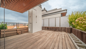 APARTMENT: The three-level maisonette spans the 5th to 7th floors and has a area of 192.65 m², including a winter garden of 12.34 m². It also comes with a balcony of 13.92 m² and a terrace of 75.61 m². The rooms are oriented to the southeast and northwest.