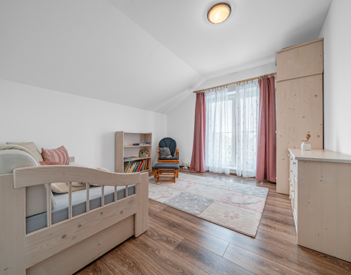 2NP: chodba, kúpeľňa s vaňou, WC a dvoma umývadlami, hlavná spálňa s klimatizáciou, dve samostatné nepriechodné izby vhodné ako dve detské izby, technická miestnosť s plynovým kotlom, práčkou + sušičkou, výstup na povalu, kde je odkladací priestor.