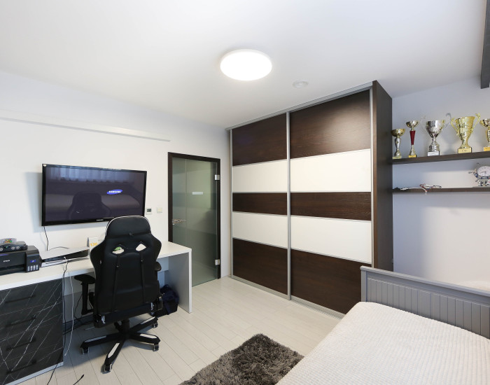 RODINNÝ DOM: Tento rodinný dom sa nachádza v pokojnej a bezpečnej lokalite, na konci slepej ulice, čo zaručuje minimálnu premávku a maximálne súkromie. Skolaudovaný bol v roku 2015 a stojí na upravenom pozemku s výmerou 484 m2. Pri výstavbe sa kládol dôraz na kvalitu – tehlová konštrukcia (30 cm) je zateplená 16 cm polystyrénom, strecha je valbová s dreveným krovom a krytinou značky Bramac. Dom bol postavený s dôrazom na dlhodobú trvácnosť aj energetickú efektivitu. Vykurovanie zabezpečuje elektrické podlahové kúrenie s individuálnou reguláciou v každej miestnosti. Komfort počas zimných dní dopĺňa krb s rozvodmi tepla do jednotlivých miestností. K dispozícii sú tri klimatizačné jednotky s možnosťou diaľkového ovládania prostredníctvom mobilnej aplikácie. Interiér domu je navrhnutý s dôrazom na eleganciu a kvalitu – všetky interiérové dvere, ako aj väčšina nábytku, boli vyrobené na mieru v luxusnom prevedení. Použité boli prevažne dyhované a lakované materiály, ktoré spájajú estetiku s funkčnosťou. Dom je vybavený moderným kamerovým systémom s možnosťou vzdialeného prístupu prostredníctvom mobilnej aplikácie.