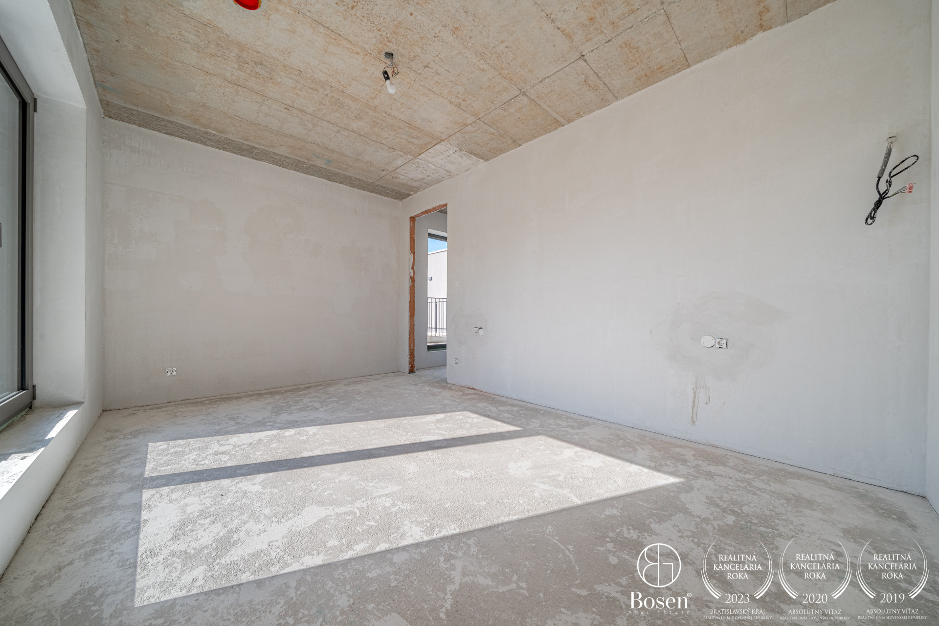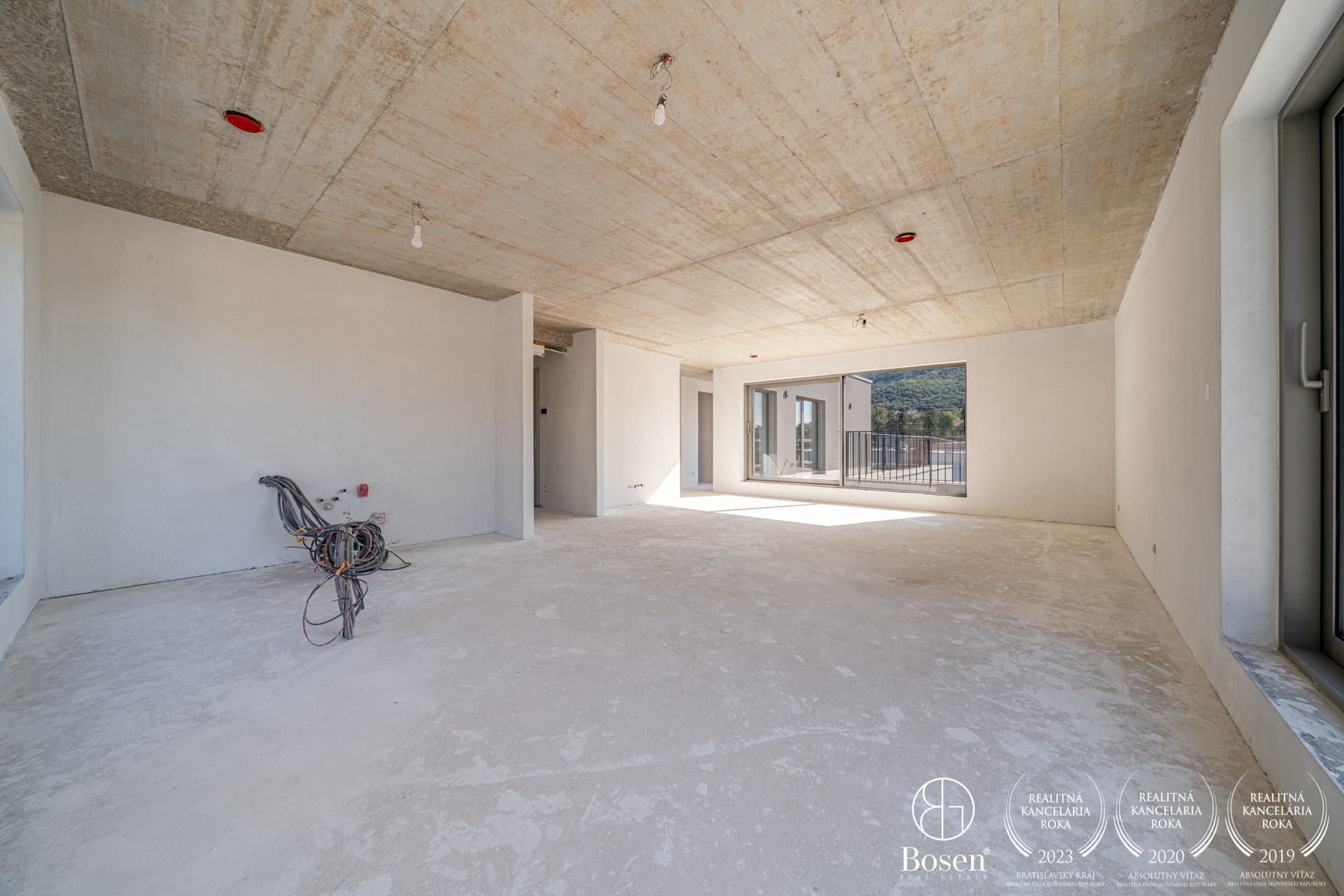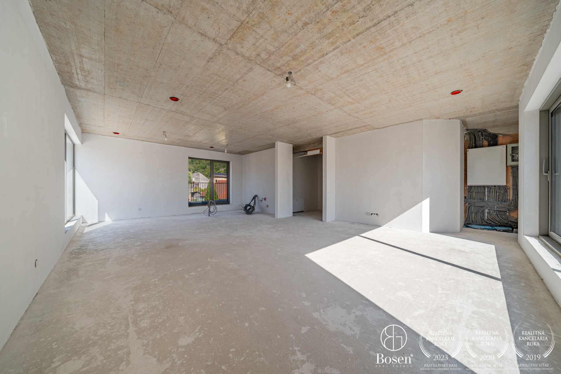 Veľkou výhodou bytu je zvýšený dizajnový betónový strop ktorý má 270cm. Všetky izby májú veľkoplošné hliníkové okná čo zabepečuje krásne presvetlenie každej izby. Vchodové dvere sú značky ADLO a majú výšku 230cm.