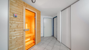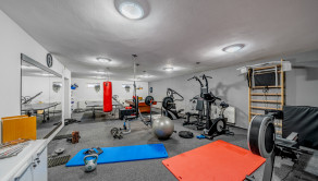 -1P: The total area of the basement is 177.93 m2. There is a fully equipped gym with an area of 69 m2, an infrared sauna, a games room, a laundry room, and a fully equipped kitchen with a gas stove.