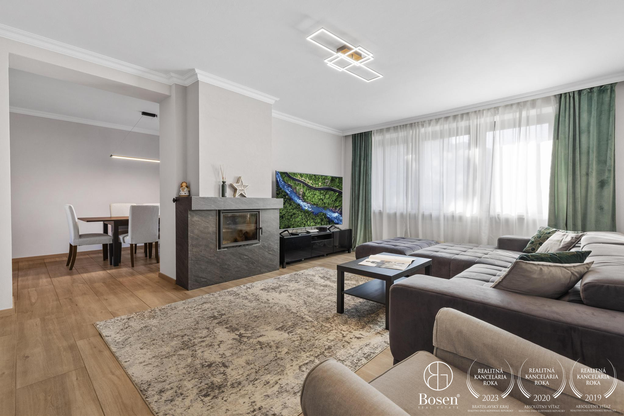 priestranná obývacia izba prepojená s jedálňou a kuchyňou s výstupom na terasu