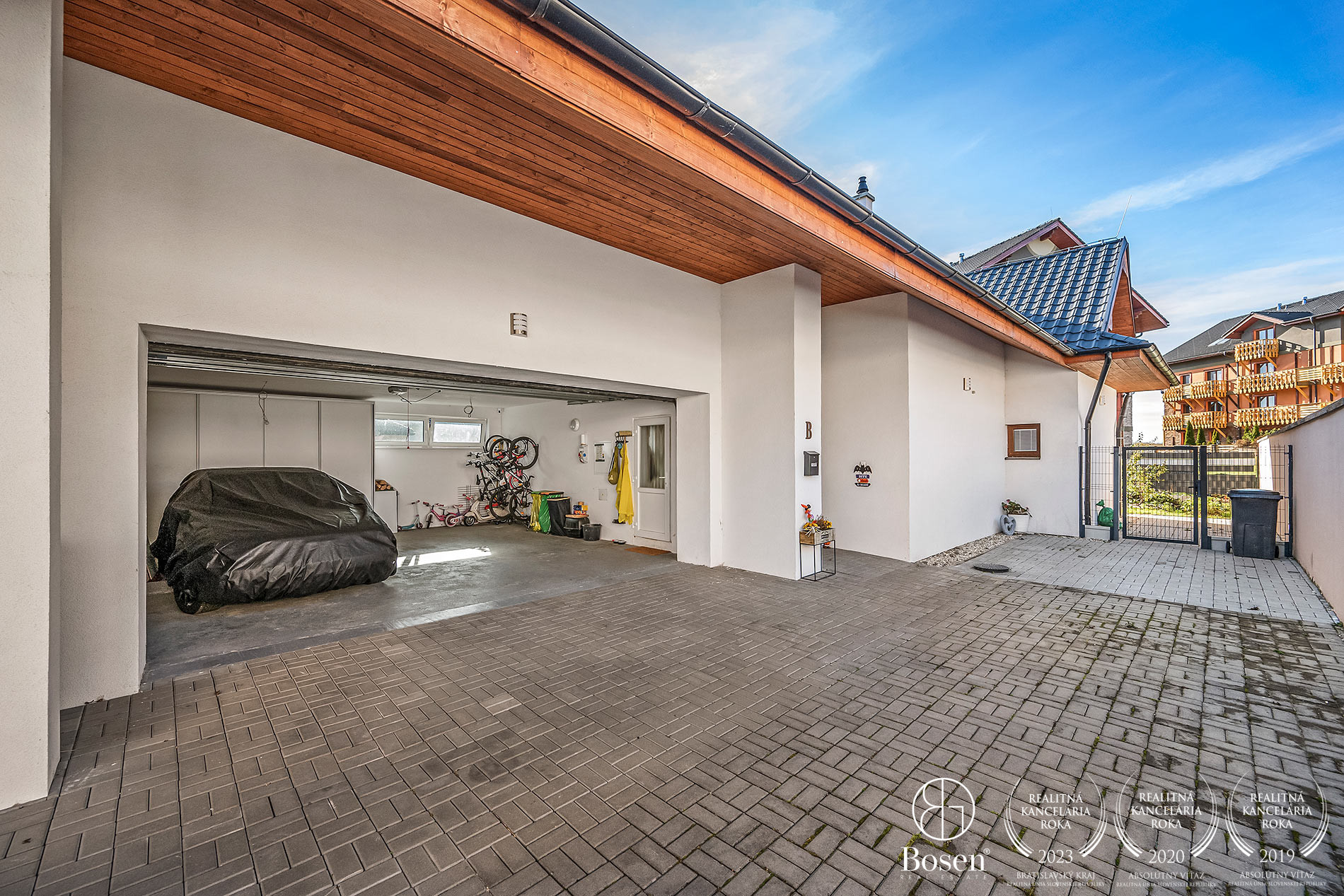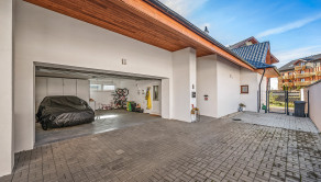PARKOVANIE: K dispozícii je garáž pre dve autá s garážovou bránou na diaľkové ovládanie, ako aj ďalšie parkovanie na pozemku. Celý areál je chránený kamerovým systémom, čo zabezpečuje maximálny komfort a bezpečie.