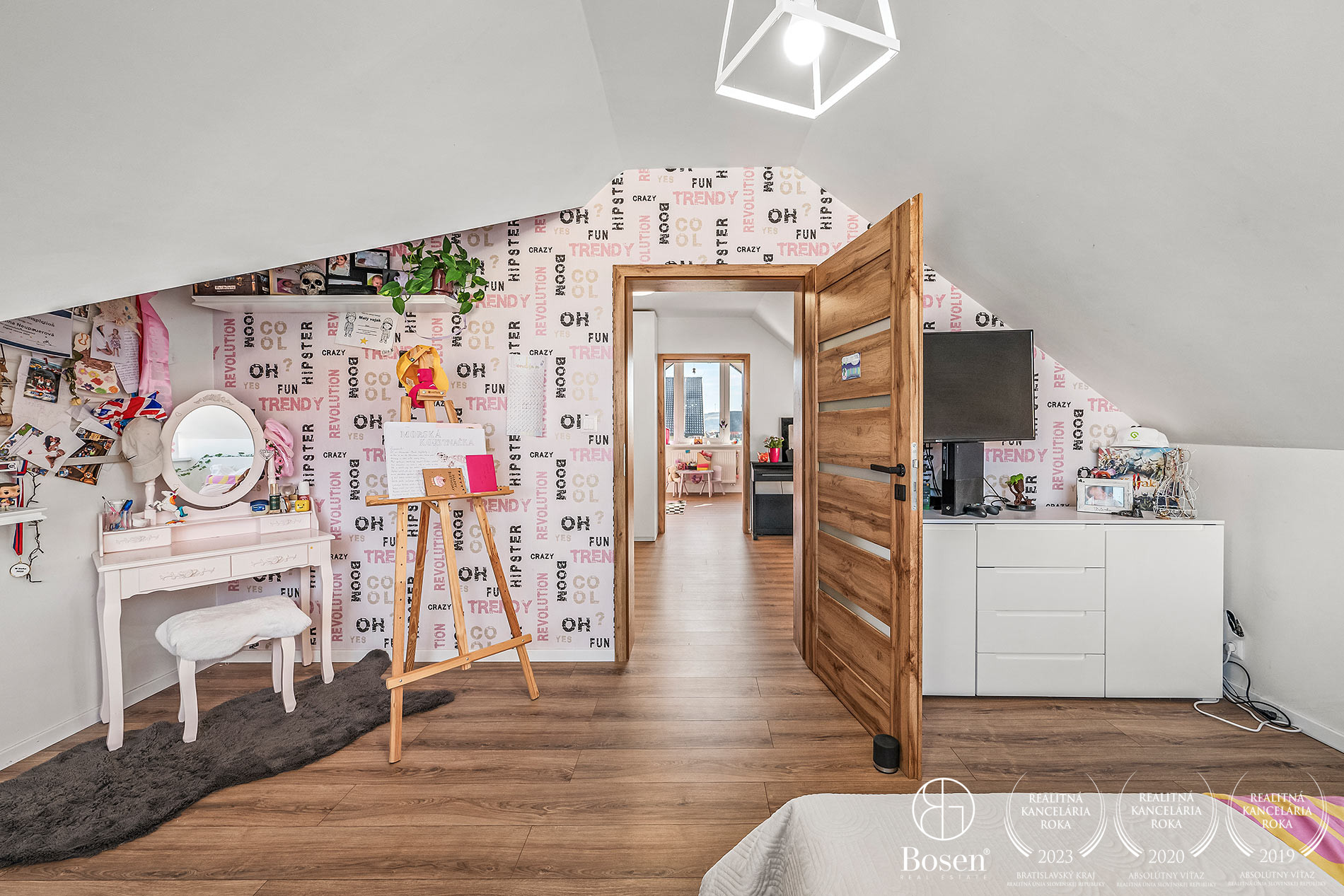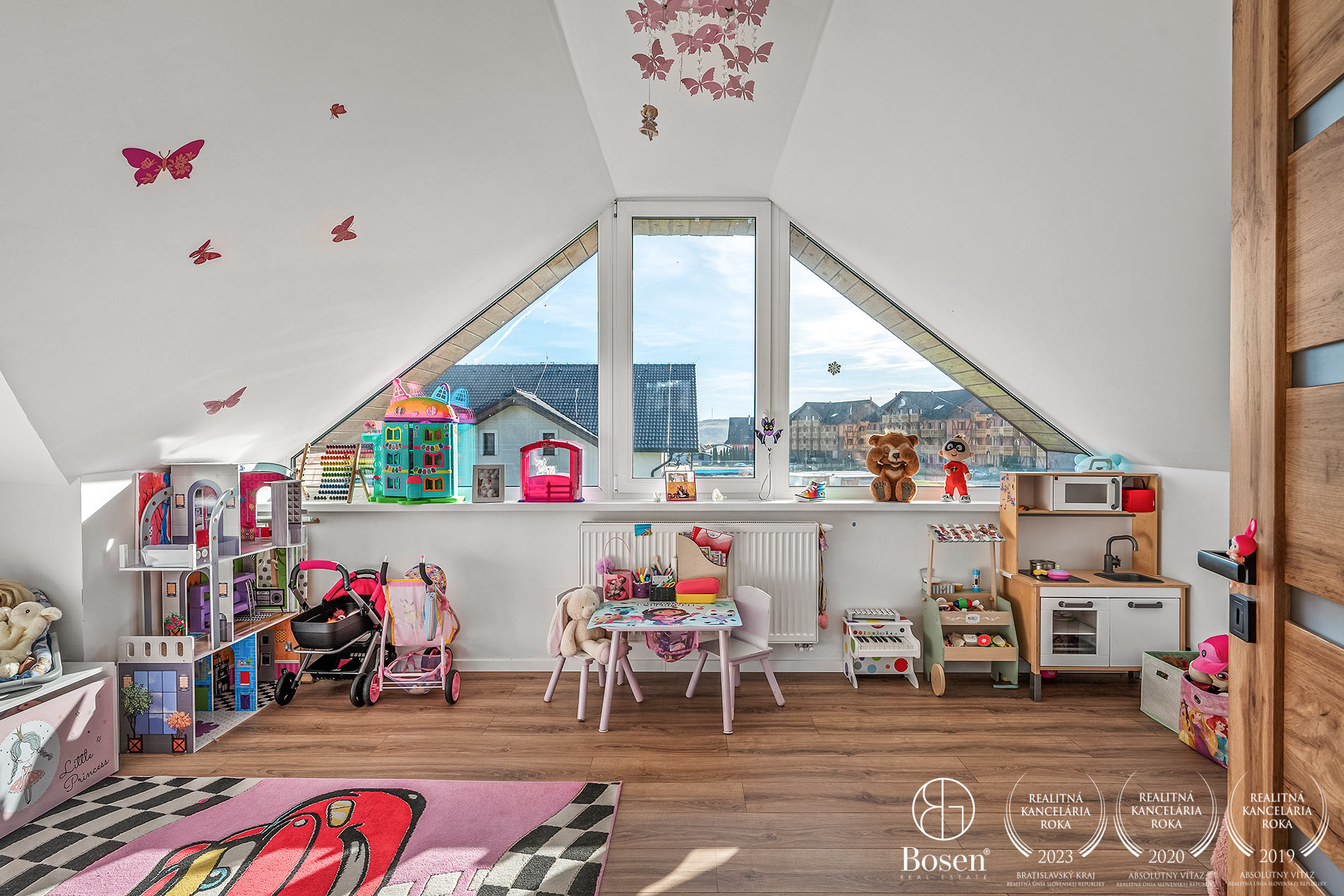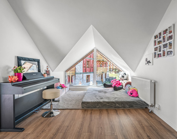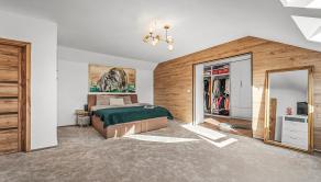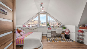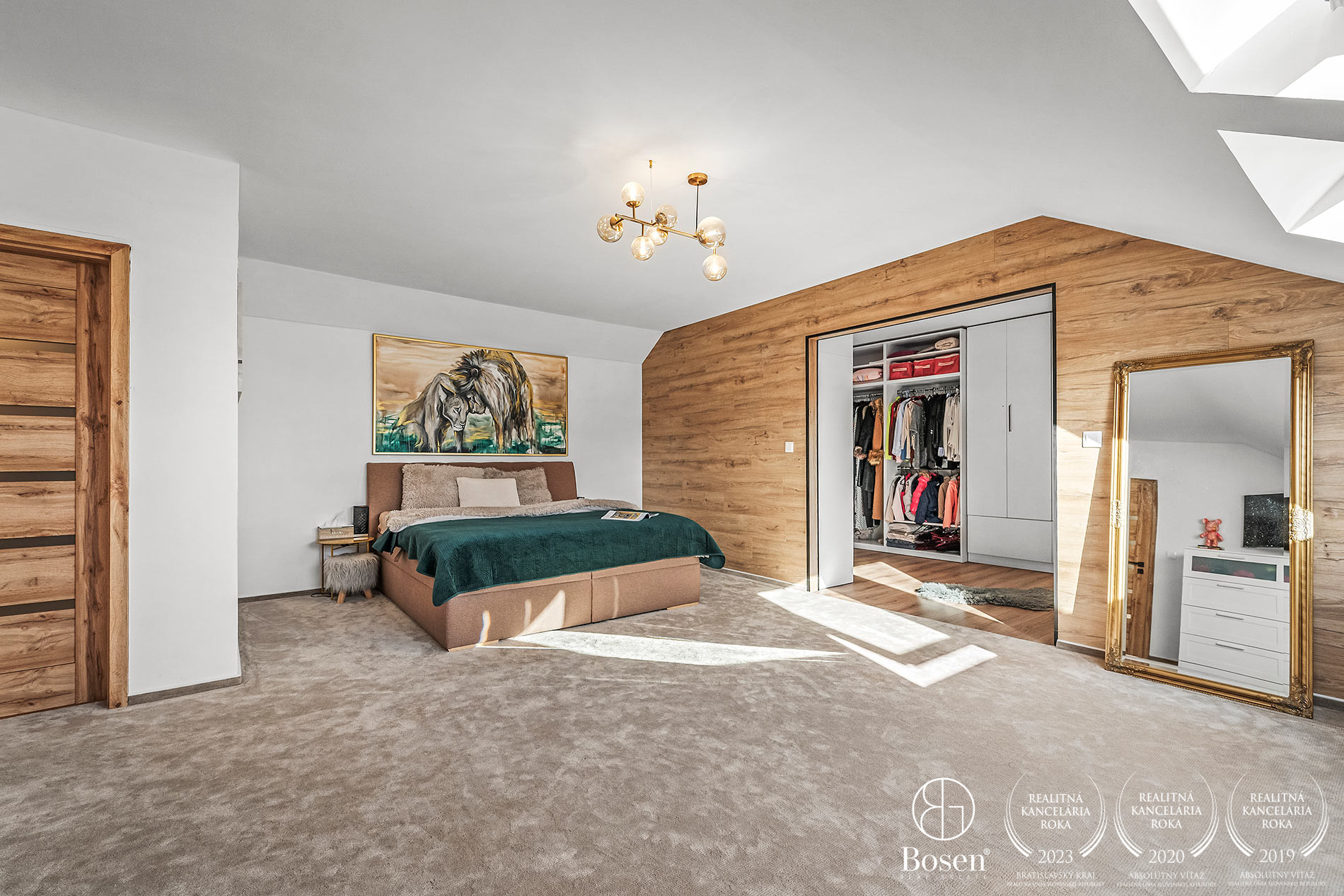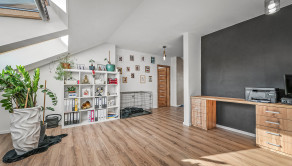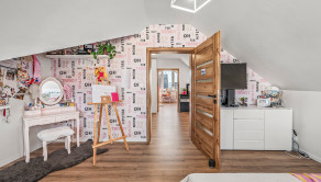 Horné poschodie ponúka dve priestranné detské izby s prechodovou herňou, ktorú je možné využiť aj ako oddychovú miestnosť. Nachádza sa tu tiež hlavná spálňa so šatníkom a vlastnou kúpeľňou s WC, pracovňa (alebo hosťovská izba) a ďalšia kúpeľňa s WC.