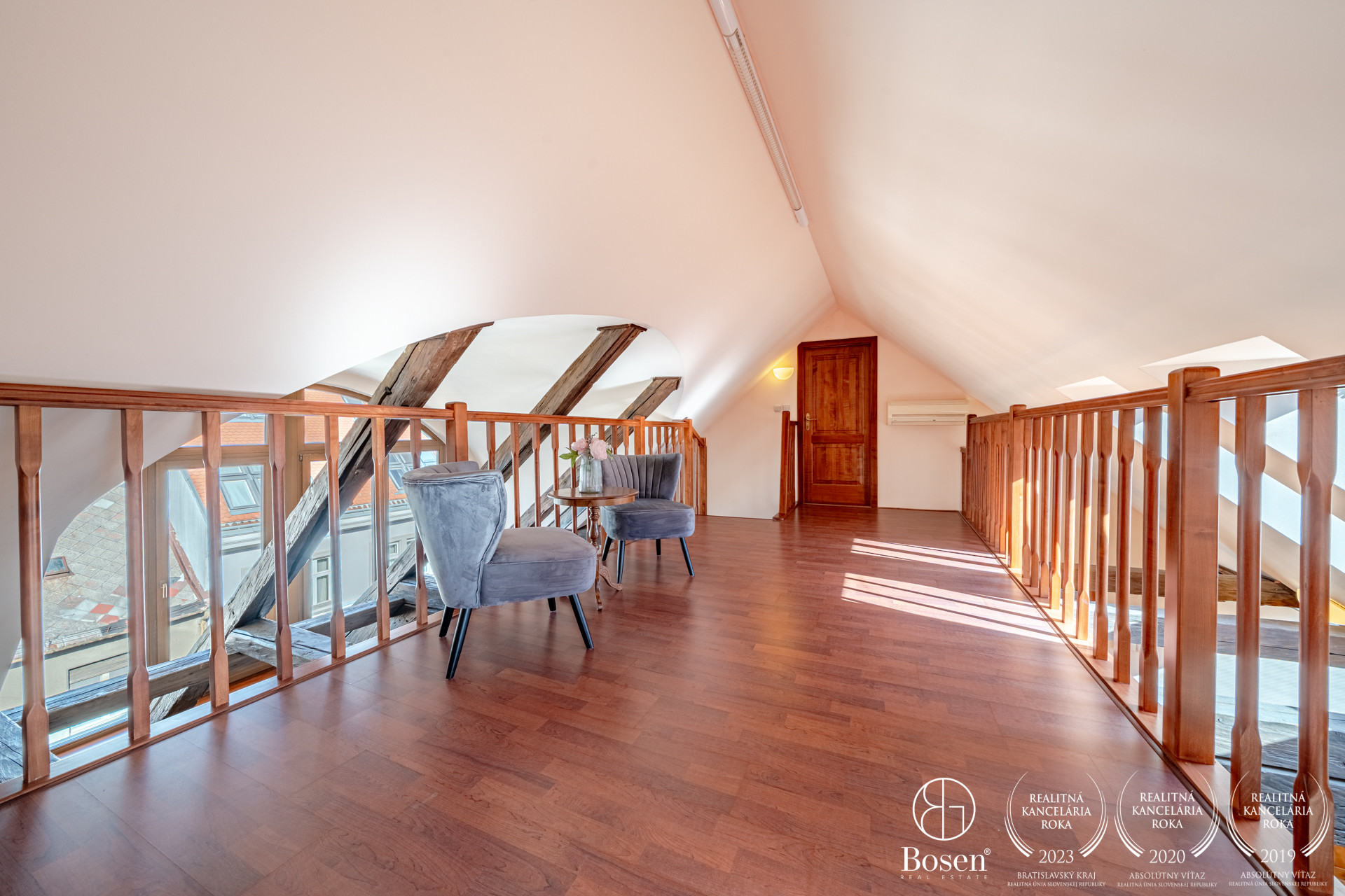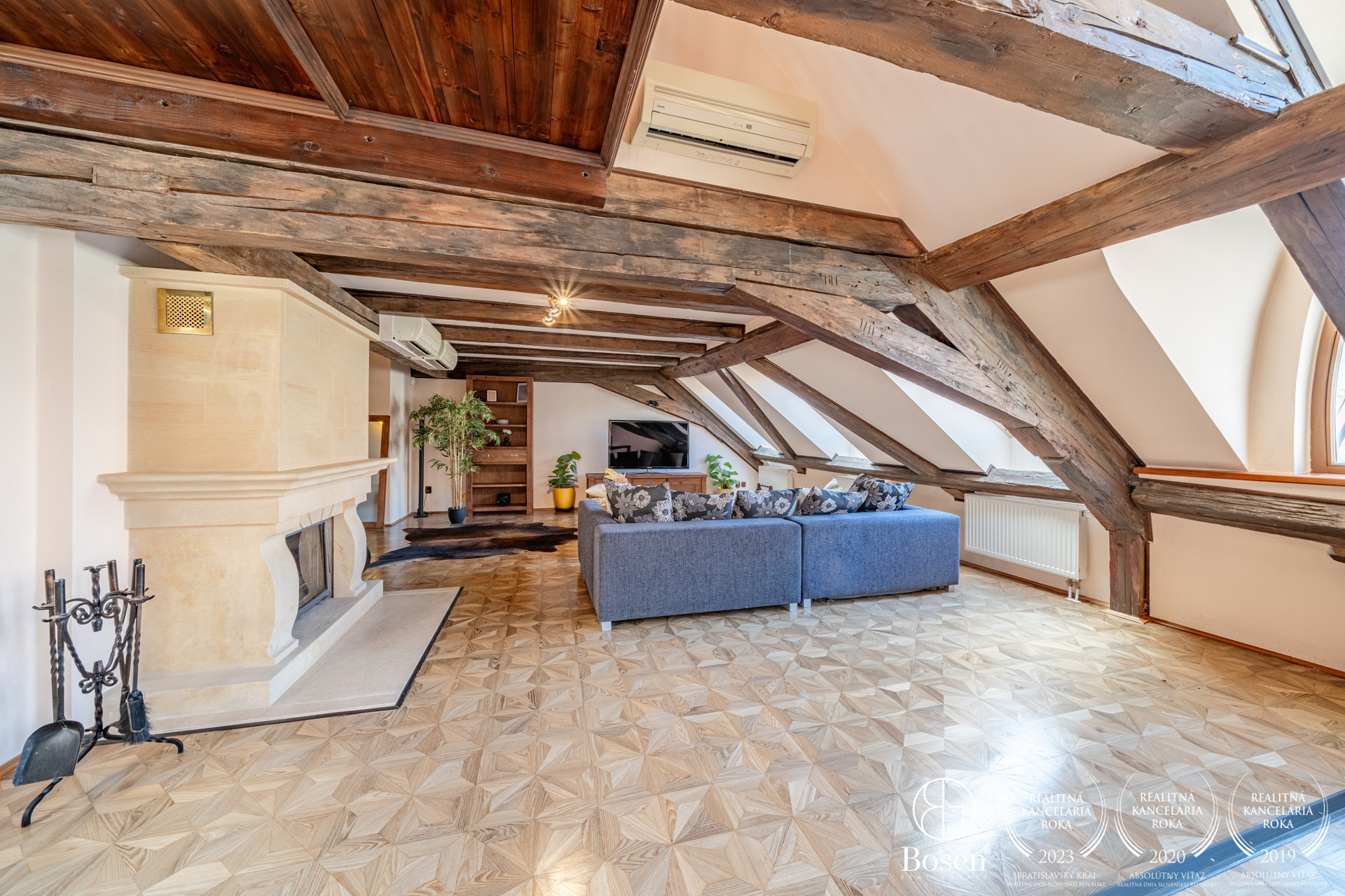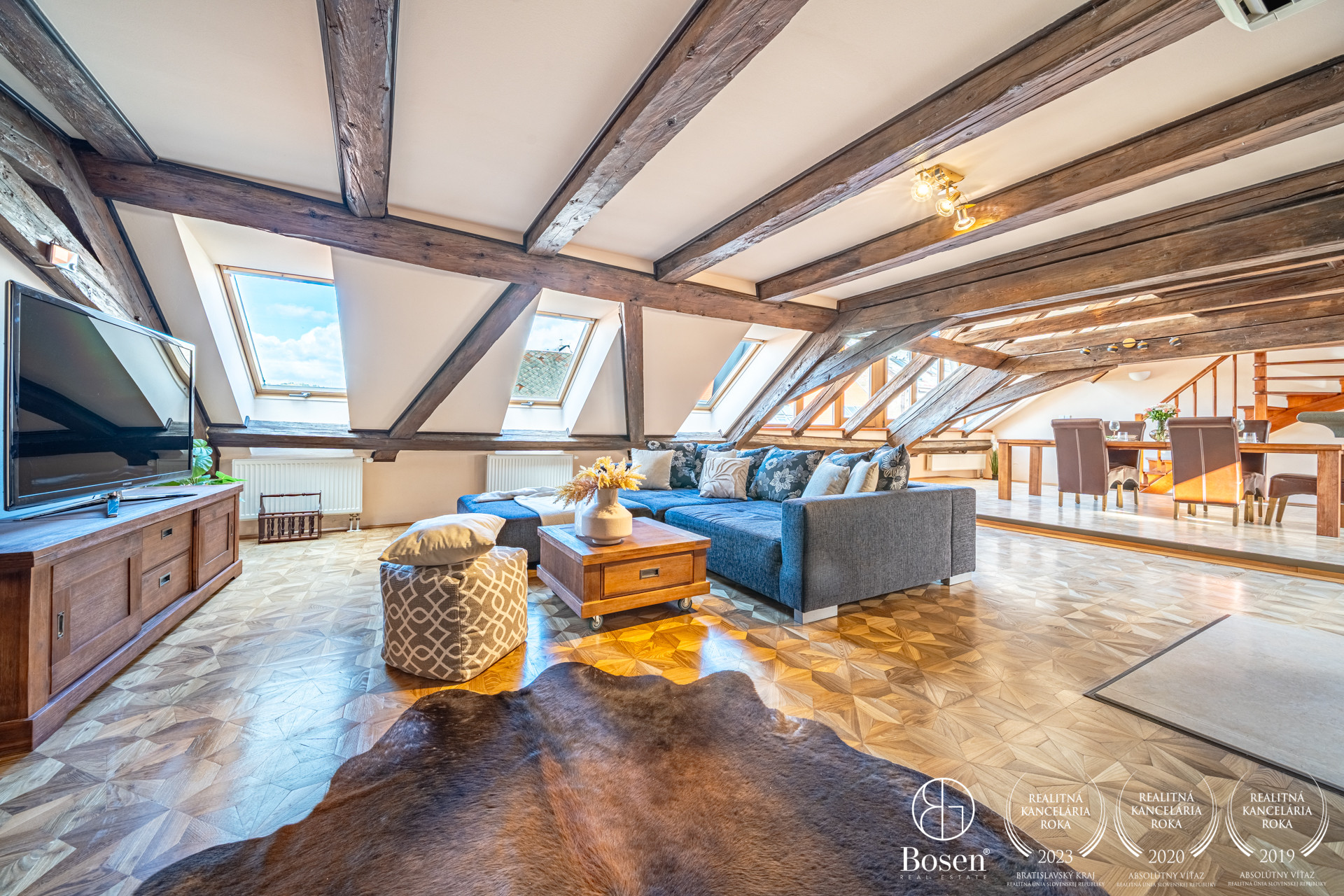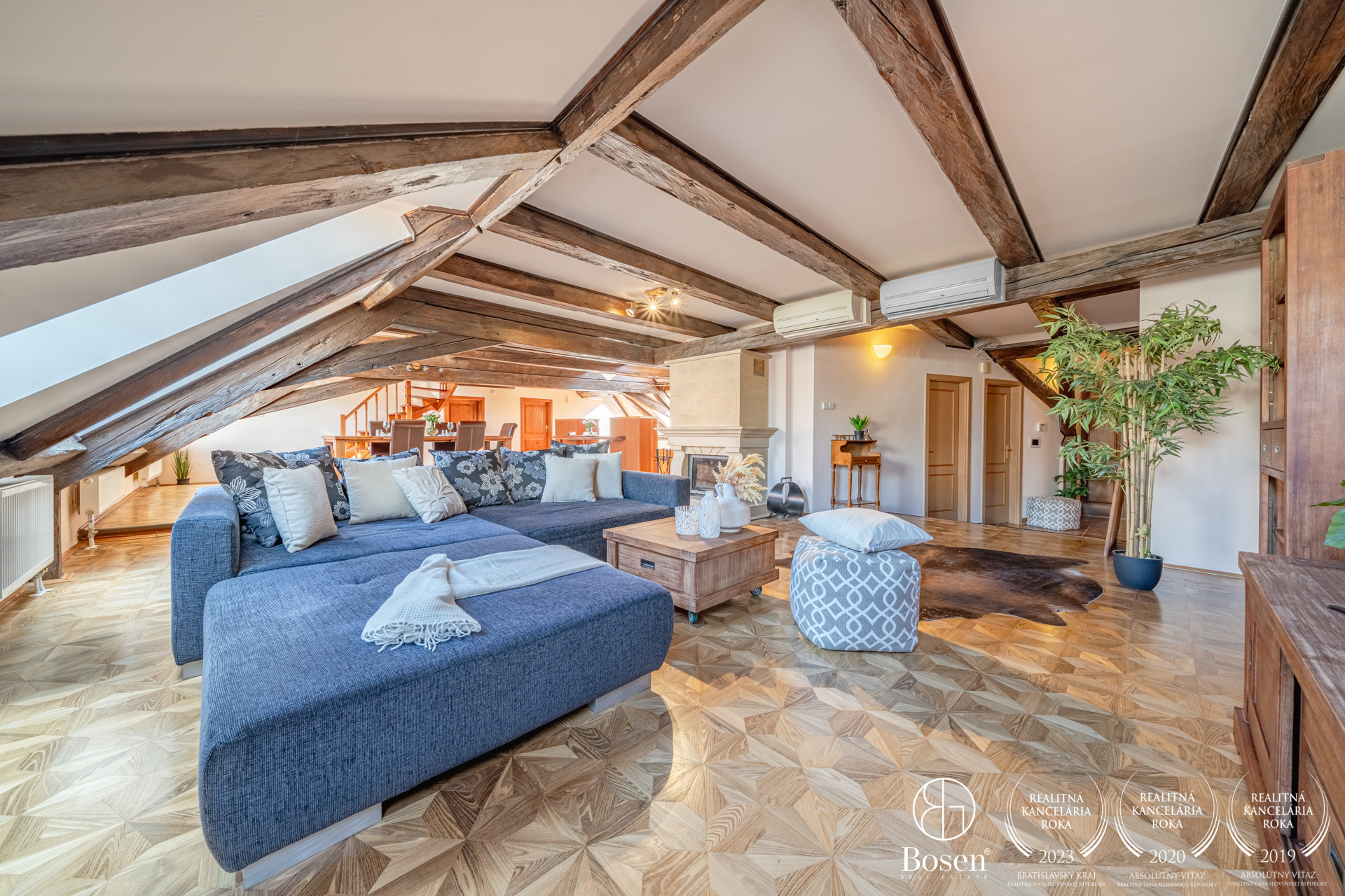 Bosen Group Real Estate Agency exclusively offers for sale a spacious 5-bedroom penthouse apartment with a unique atmosphere, located on the 4th floor of the Esterházy Palace, one of the most significant baroque buildings in the historical centre of Bratislava. The property stands out for its combination of historical character, preserved original beams and a generous total area of 228 m², creating a truly exceptional living space in the heart of the Old Town.