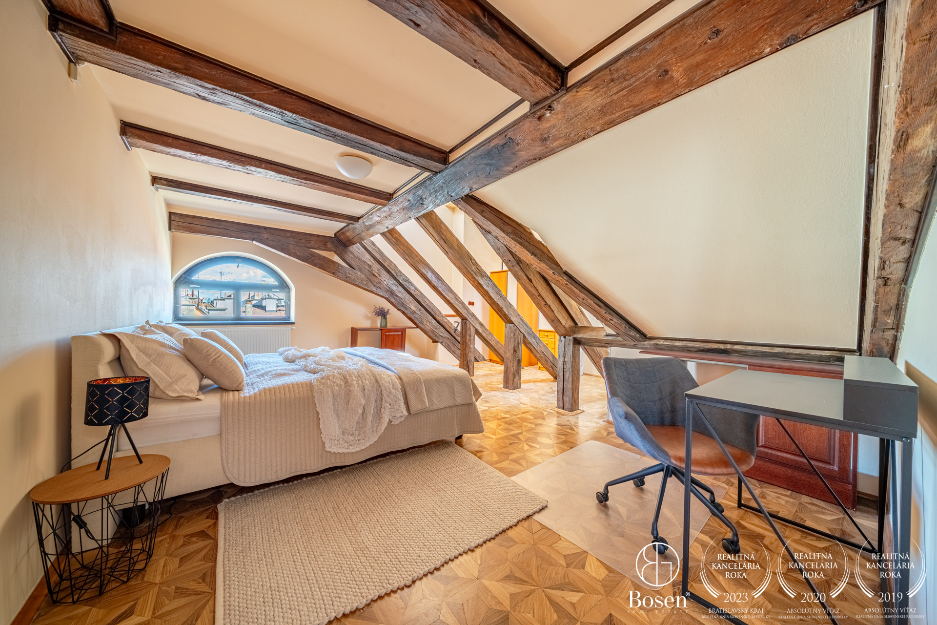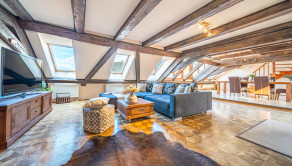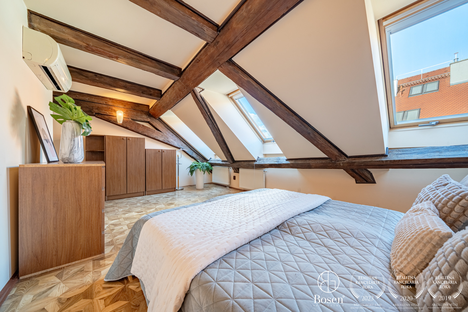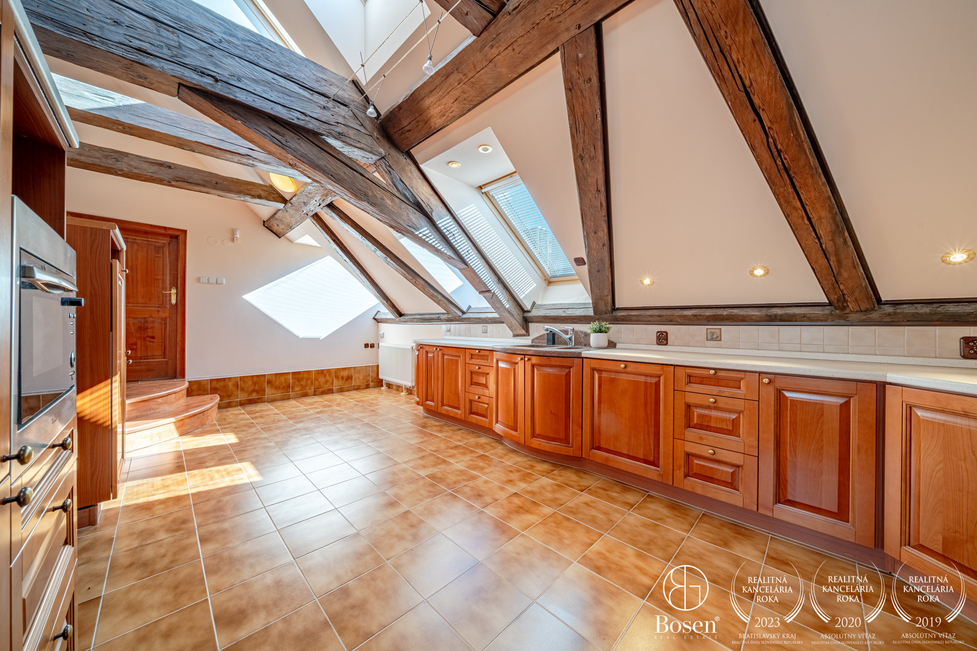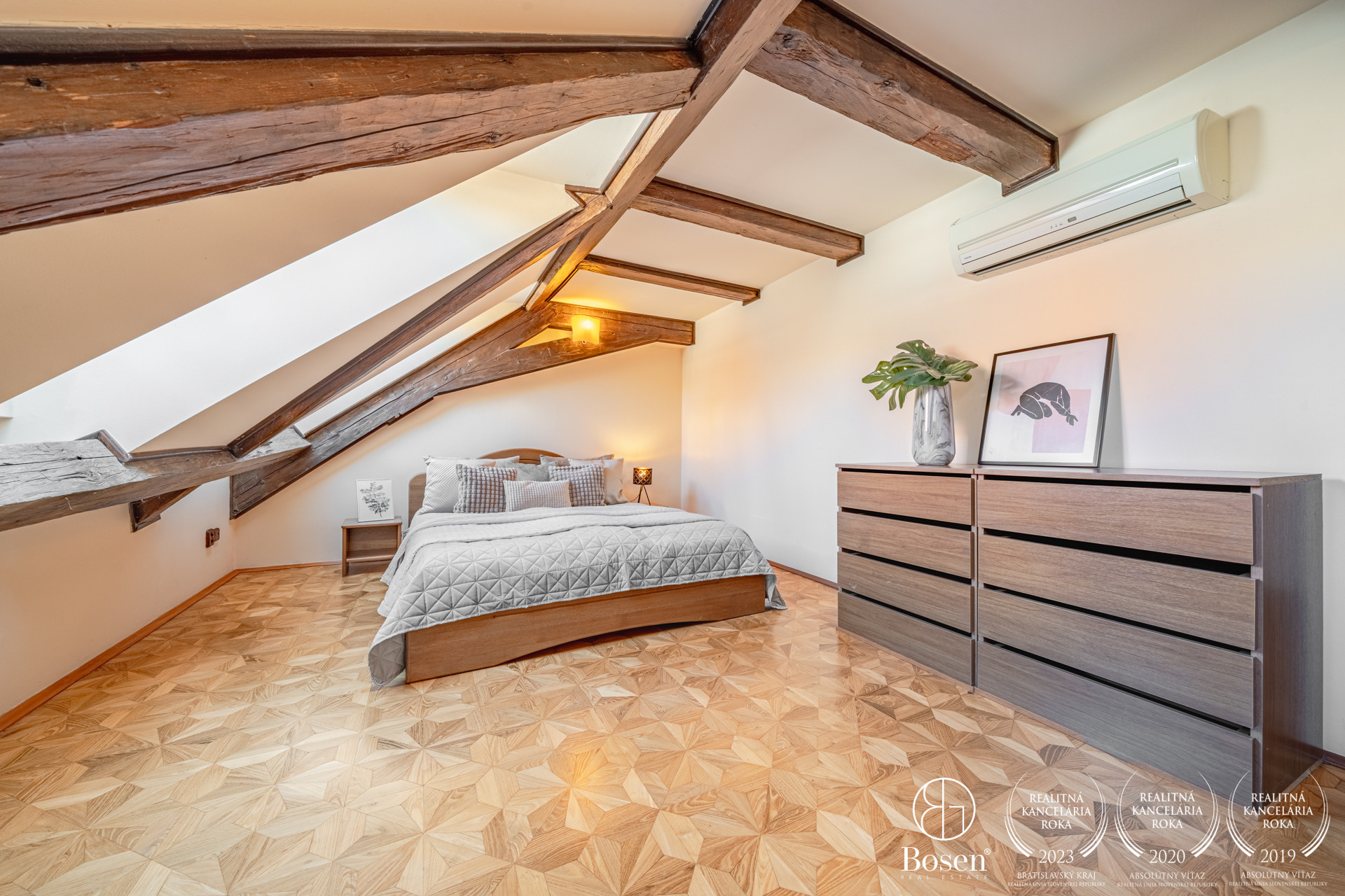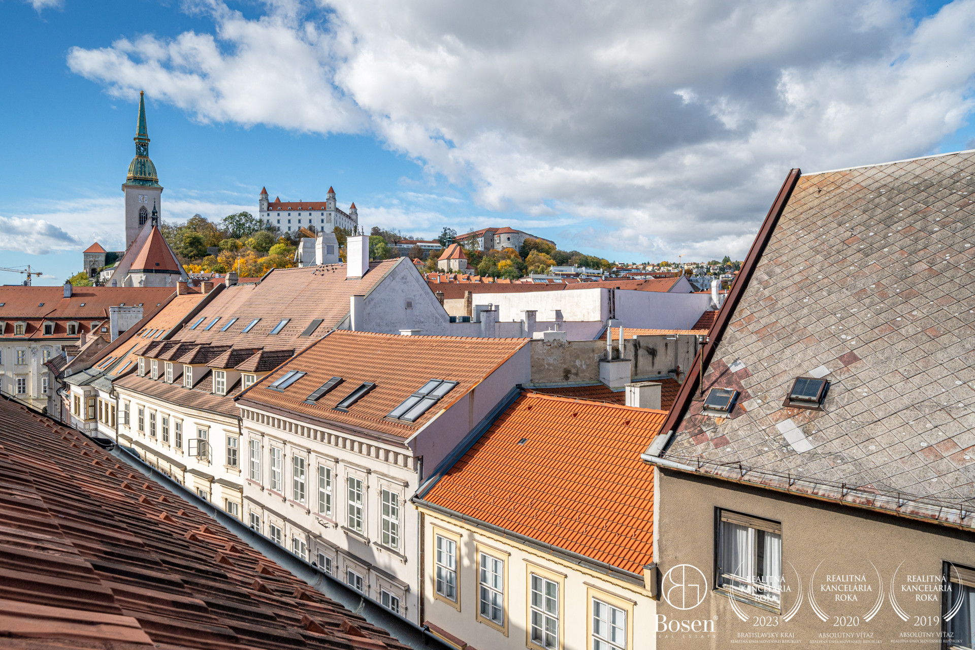 Bosen Group Real Estate Agency exclusively offers for sale a spacious 5-bedroom penthouse apartment with a unique atmosphere, located on the 4th floor of the Esterházy Palace, one of the most significant baroque buildings in the historical centre of Bratislava. The property stands out for its combination of historical character, preserved original beams and a generous total area of 228 m², creating a truly exceptional living space in the heart of the Old Town.