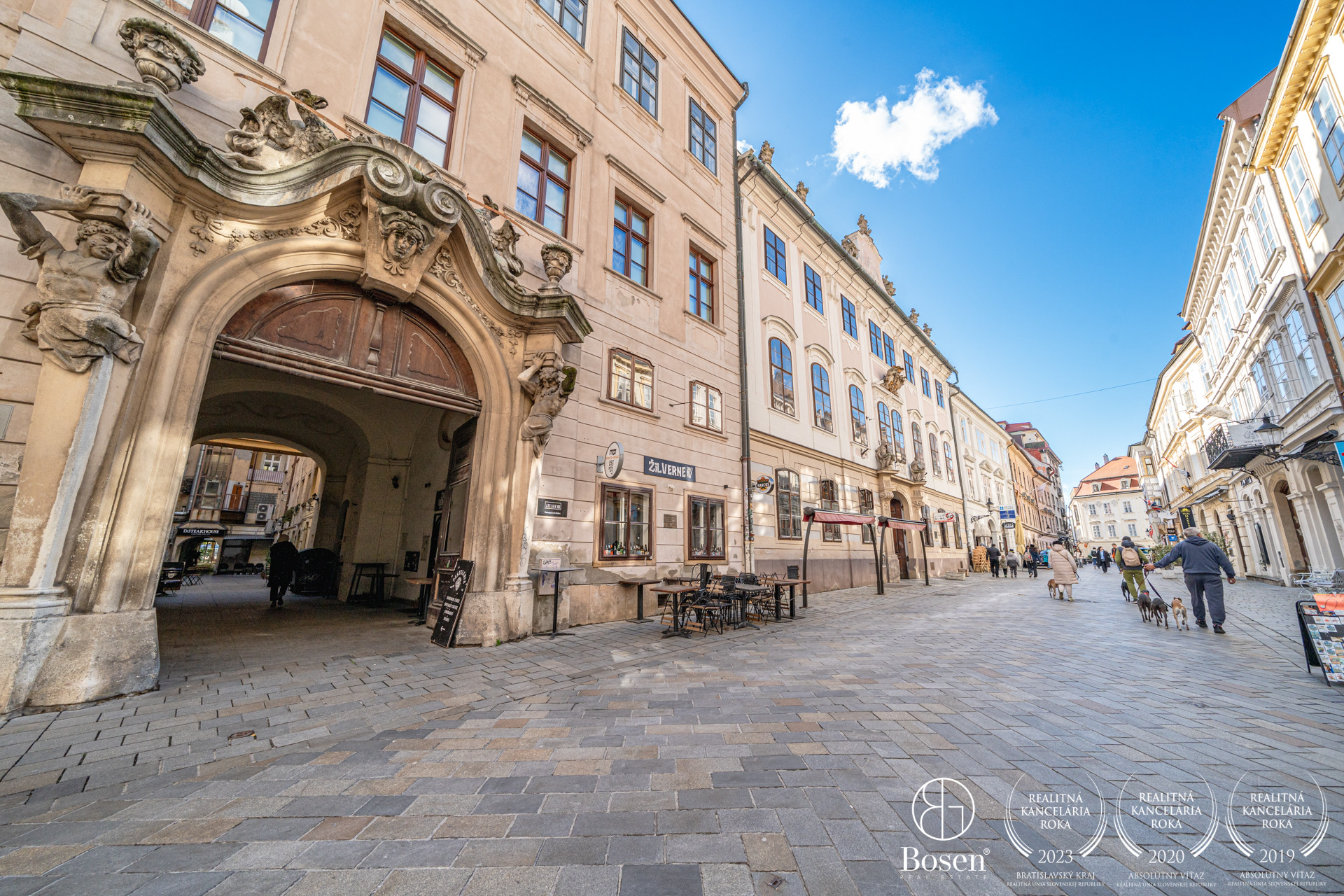 BUILDING AND LOCATION: The Esterházy Palace, built in the 18th century, is one of Bratislava’s architectural landmarks. It is situated directly on Panská Street, in the pedestrian zone of the Old Town, surrounded by cafés, restaurants, galleries and historical monuments. The construction of a new elevator is planned, which will further enhance the comfort of living. Parking is available through residential permits or rental in nearby garages.