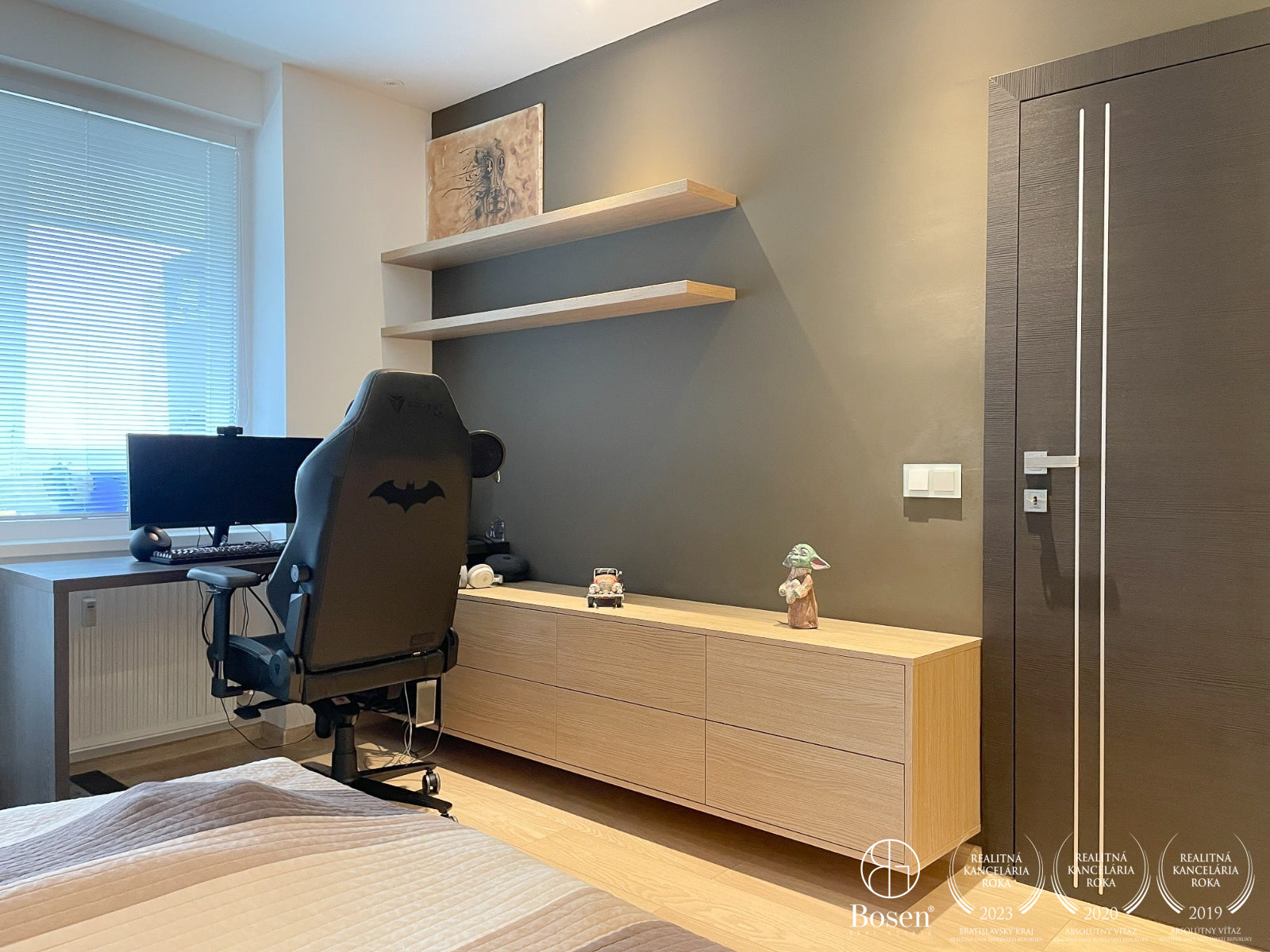 V obývacej časti bytu sa nachádza gauč, konferenčný stolík. Spálňa disponuje priestrannou vstavanou skriňou, manželskou posteľou a pracovným stolom.
