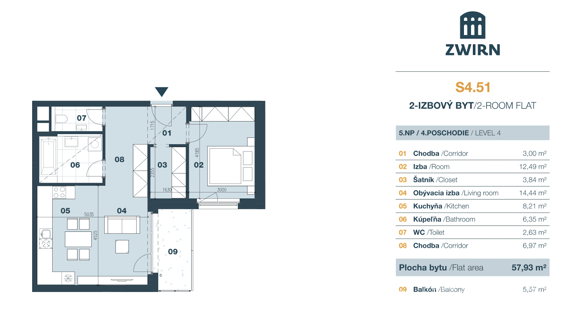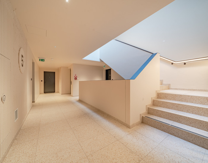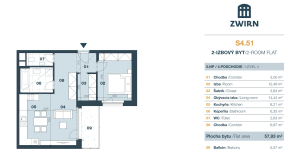 BYT: Celková výmera bytu je 65,7 m2 z čoho balkón predstavuje 5,57 m2 a pivničná kobka 2,21 m2. Byt sa nachádza na 4. poschodí novostavby z celkových 7. Bol skolaudovaný v roku 2025. Je orientovaný na severozápad/juhozápad, čo zabezpečuje dostatok denného svetla.