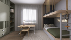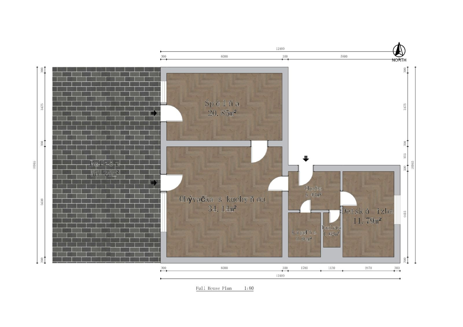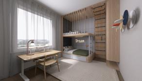 DISPOZÍCIA: priestranná vstupná chodba (5,27 m2), samostatné WC, kúpeľňa s vaňou, detská izba (11,79 m2), obývacia izba spojená s kuchyňou (34,12 m2) s výstupom na terasu, spálňa (20,24 m2) s výstupom na terasu