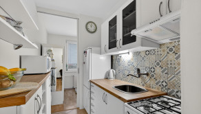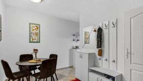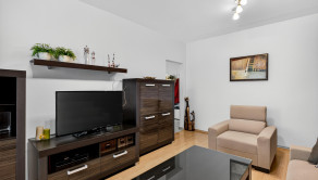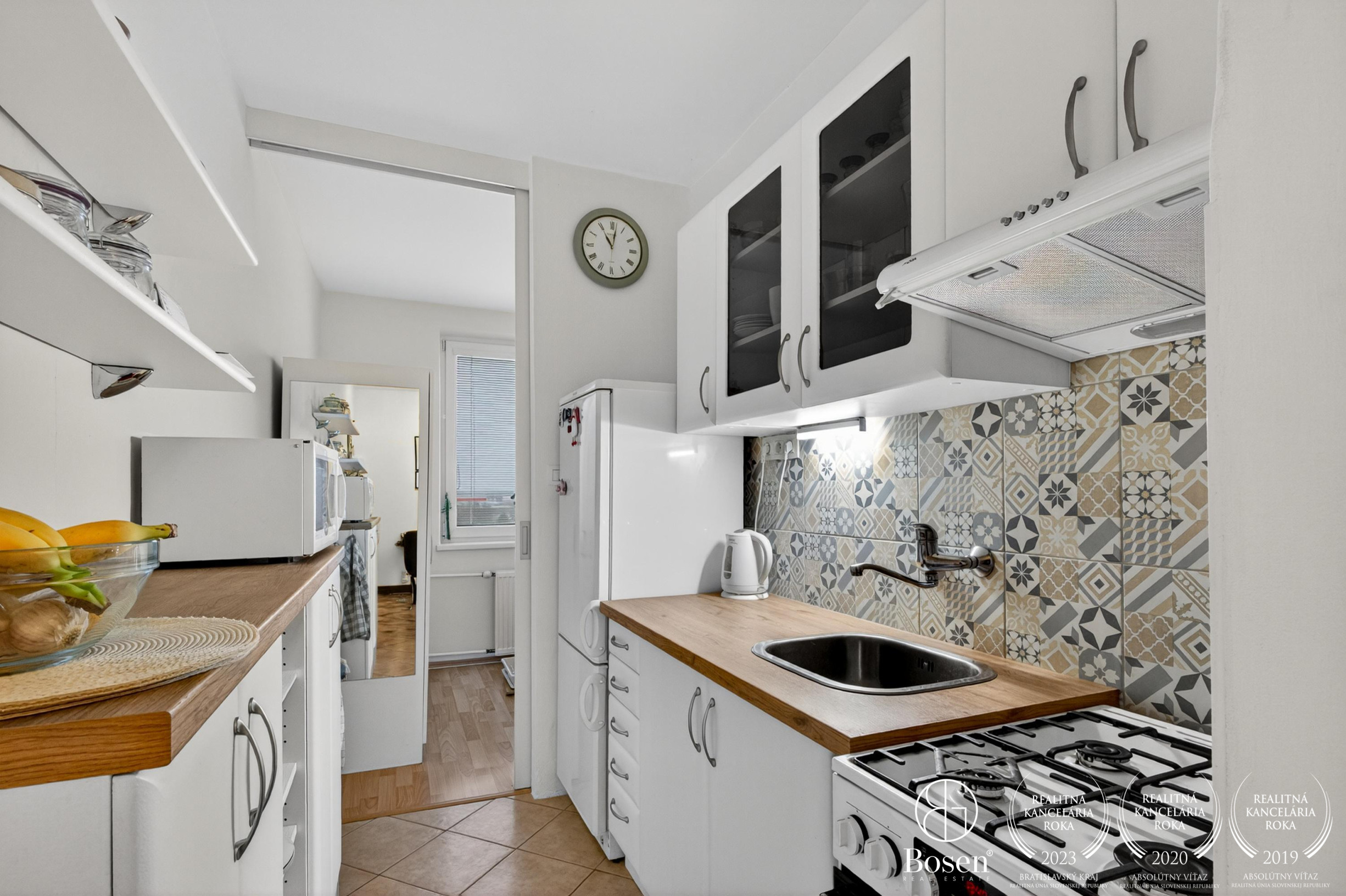 DISPOZÍCIA: Chodba, z ktorej je vstup do kúpeľne s WC, kuchyne a spálne vpravo, detskej izby a obývačky vľavo. Kuchynská linka je vybavená zabudovanými spotrebičmi a je priechodná pre spálňu. Kúpeľňa s WC je vybavená sprchovacím kútom a práčkou. Súčasťou bytu sú dve loggie, pričom jedna z nich je plne presklená a prístup k nim je z detskej izby a obývačky. Ďalším príslušenstvom bytu je murovaná pivnica situovaná na prízemí bytového domu s výmerou 1,9 m2.