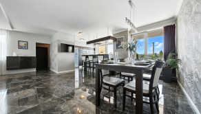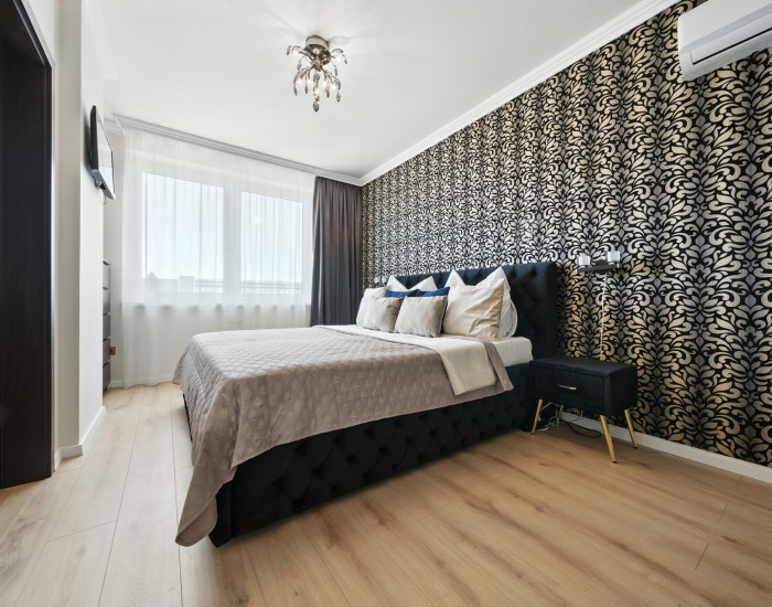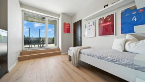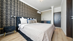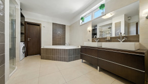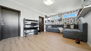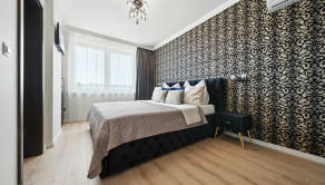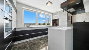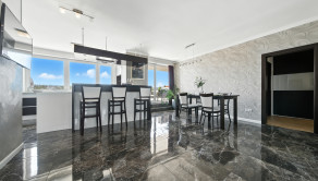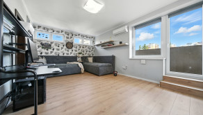 The apartment is located on the top, fifth floor of a residential building with an elevator. The entrance hall offers plenty of storage space and leads into a spacious living room connected to the kitchen and dining area. The kitchen is equipped with appliances and a practical pantry. The living area has direct access to both terraces. The apartment features a master bedroom and two separate rooms, which can be used as children's rooms, an office, or guest rooms. There are two bathrooms – the first is equipped with a bathtub, shower, toilet, and space for a washing machine and dryer; the second bathroom has a shower and toilet. There is also a balcony accessible from the night area. The comfort of living is enhanced by underfloor heating, air conditioning, exterior blinds, and a dominant fireplace that creates a pleasant atmosphere. In 2025, the flooring in the apartment was replaced. The apartment also includes a cellar.